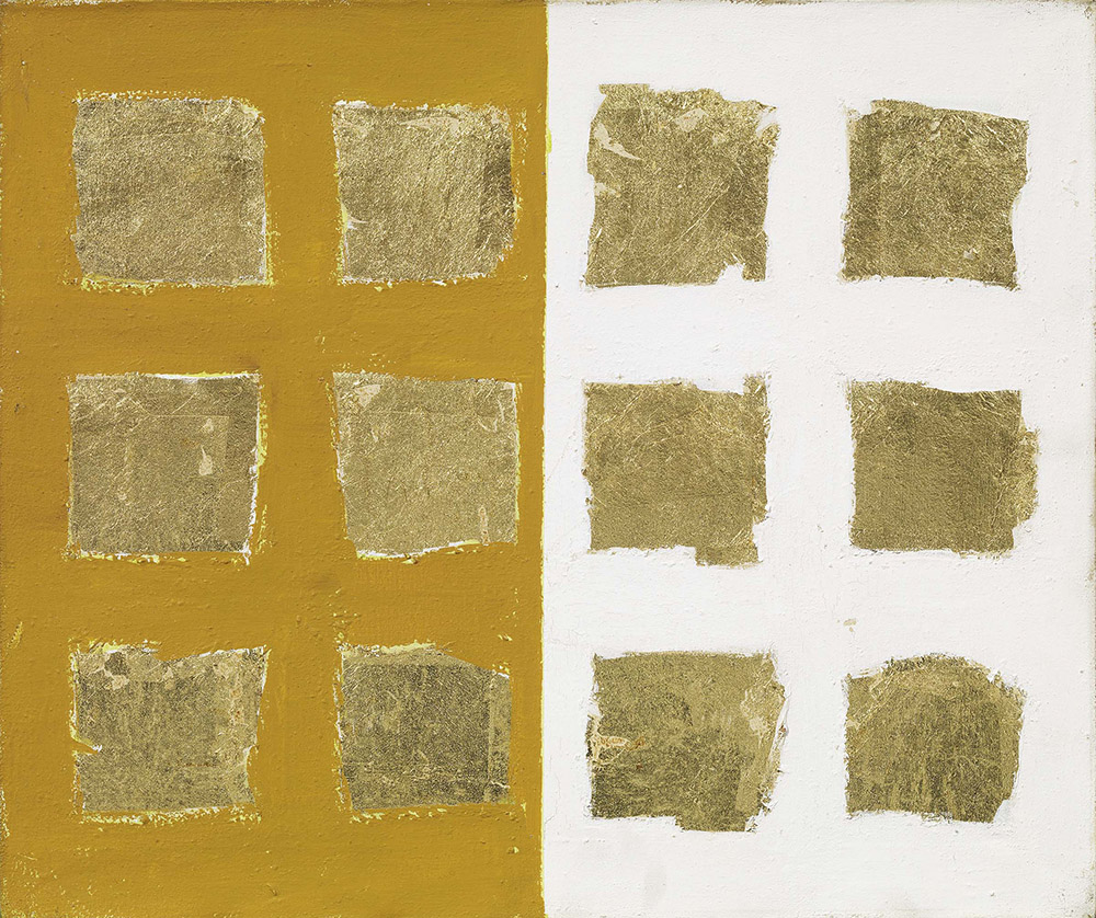 Remo Bianco, Milano 1922 - 1988, Senza titolo, 1961, Olio e oro su tela, cm. 50x60, Firma e data al verso sulla tela: Bianco 61; sulla cornice: etichetta Galleria d'Arte del Naviglio, Milano., Storia: Collezione Renato Giani, Montecatini Terme; Collezione privata,