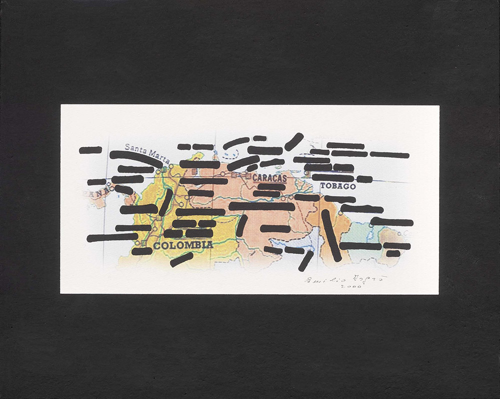 Emilio Isgrò, Barcellona Pozzo di Gotto (Me) 1937, Colombia, 2000, Tecnica mista su carta applicata su tavola, cm. 15x30 (carta), Firma e data in basso a destra: Emilio Isgrò$2000; al verso: Colombia, con n. CL 29., Foto autenticata dall'artista.,
