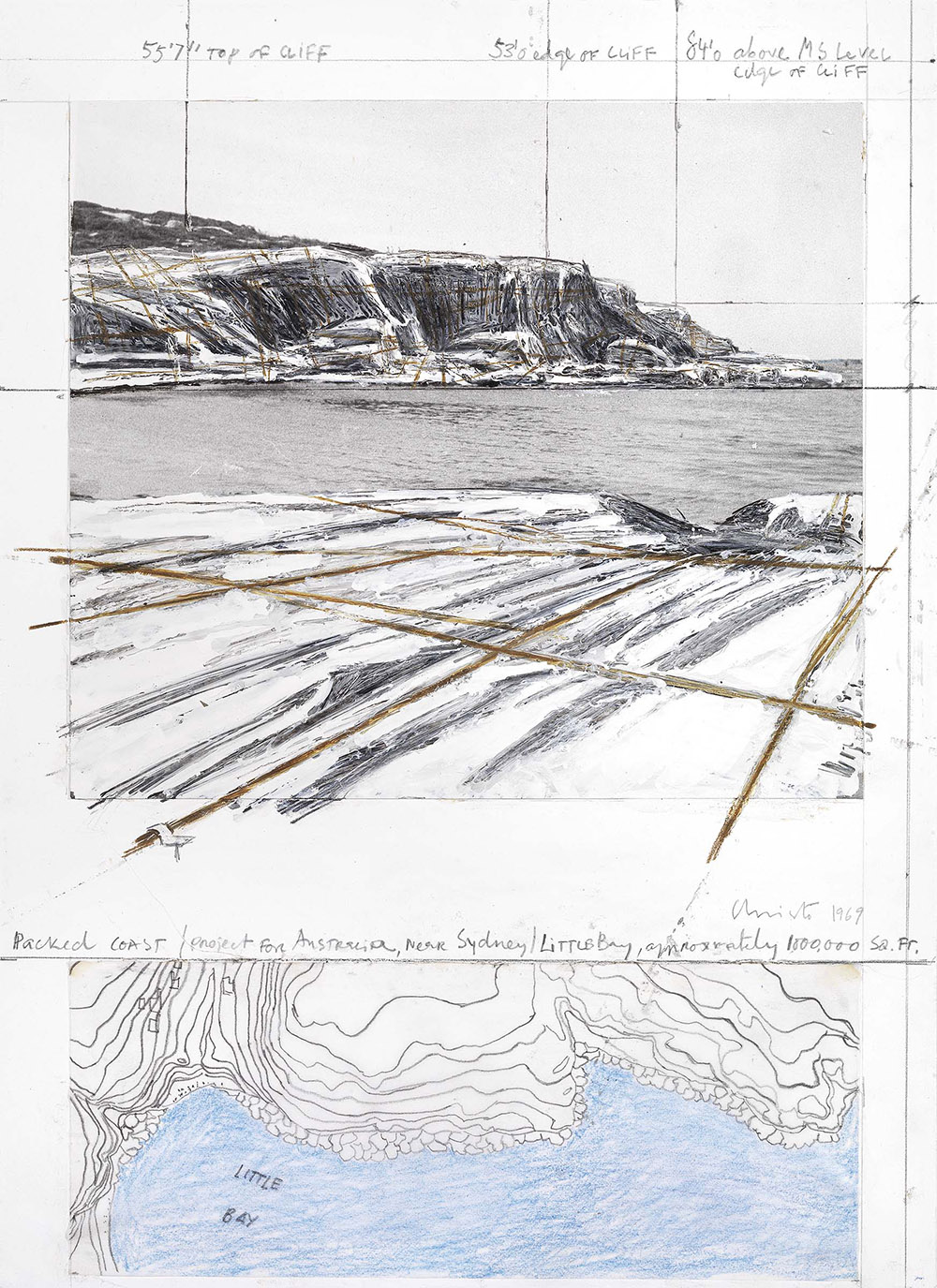 Christo, Gabrovo 1935, Packed Coast, Project for Australia, Little Bay, 1969, Tecnica mista e collage su carta applicata su tavola, cm. 38,7x28, Firma, data e titolo in basso: Christo 1969 / Packed coast, Project for Australia, near Sidney, Little Bay approximately 1.000.000 Sq. Ft.; firma e data al verso sulla tavola: Christo 1969: due etichette con dati dell'opera, di cui una con n. 23: etichetta Christo e / Jeanne-Claude / Museo d'Arte Moderna / Lugano / Svizzera / 12 marzo - 18 giugno 2006., Foto autenticata dall'artista in data 2005., Esposizioni: Christo and Jeanne-Claude, Venezia, Contini Galleria d'Arte, 4 giugno - 25 luglio 2004, cat. p. 47, illustrato a colori;, Christo e Jeanne-Claude, Lugano, Museo d'Arte Moderna, Villa Malpensata, 12 marzo - 18 giugno 2006, cat. p. 116, illustrato a colori.,