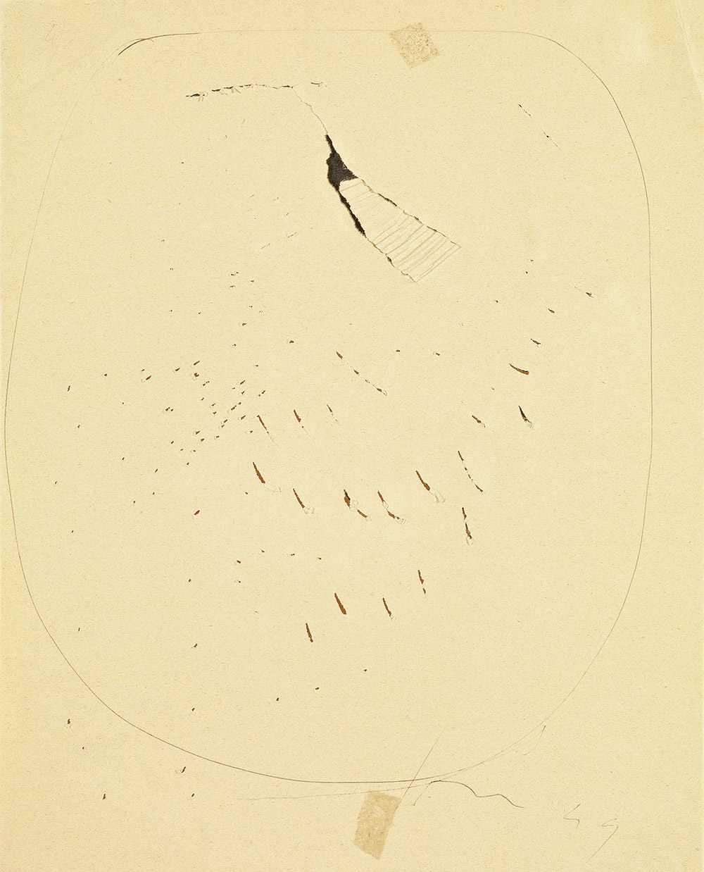 Lucio Fontana, Rosario Santa Fè 1899 - Varese 1968, Concetto spaziale, 1949, Penna a sfera, buchi e strappi su carta, cm. 33x23,5, Firma e data in basso a destra: Fon 49., Storia: Collezione Teresita Rasini Fontana, Milano; Collezione G. A. Roccamonte, Roma; Collezione privata, Roma; Collezione privata, Bibliografia: Luca Massimo Barbero, Lucio Fontana. Catalogo ragionato delle opere su carta, con la collaborazione di Nini Ardemagni Laurini e Silvia Ardemagni, Skira, Ginevra-Milano, 2013, p. 500, n. 49 DSP 68.,