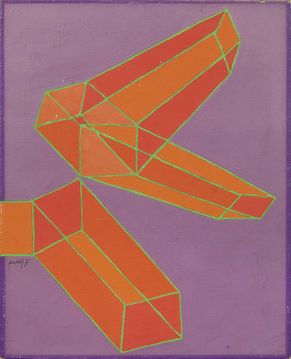 Achille Perilli, Roma 1927, Lo sguardo nel vuoto, 1971, Olio su tela, cm. 50x40, Firma e data in basso a sinistra: Perilli 71; firma, data e titolo al verso sulla tela: Achille Perilli / 1971 / Lo sguardo nel / vuoto; sul telaio: etichetta Marlborough Galleria d'Arte, Roma, con n. R2646.,