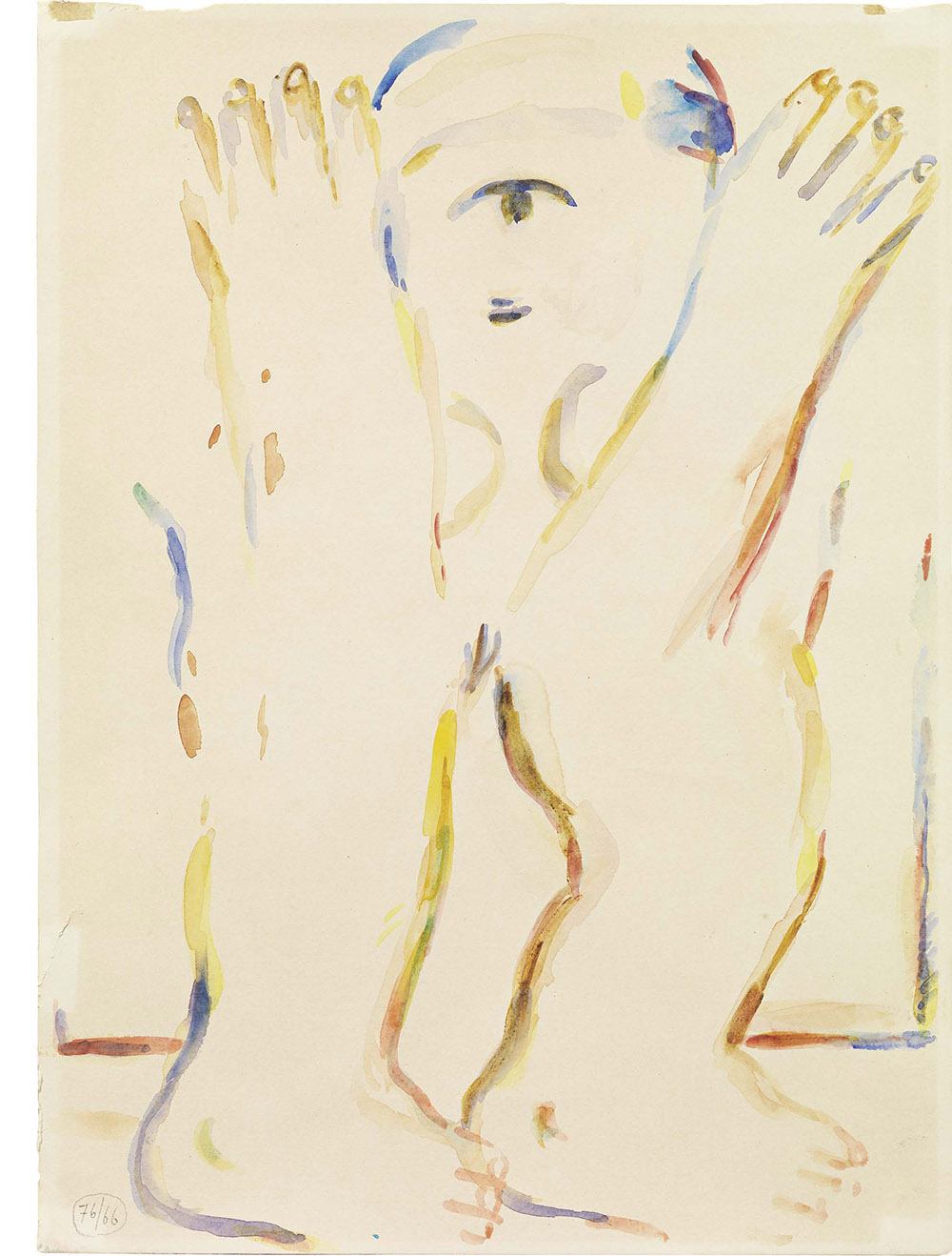 Horst Antes, Happenheim 1936, Senza titolo, (1966), Acquerello su carta, cm. 36,9x27, In basso a sinistra scritta: 76/66. Al verso, su un cartone di supporto: etichetta XXXIII Biennale Internazionale d'Arte / di Venezia - 1966, con n. 732., Storia: Collezione Renato Giani, Montecatini Terme; Collezione privata,