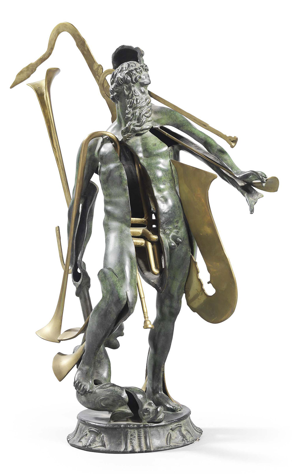 Arman, Nizza 1928 - 2005, Maschio delle acque, Scultura in bronzo verde e dorato, es. II/IV, cm. 90 h., Firma e tiratura sulla base: Arman / II/IV: punzone Fonderia Arte F.lli Bonvicini / Sommacampagna., Foto autenticata dall'artista, con timbro Fonderia artistica Bonvicini, Verona (in fotocopia).