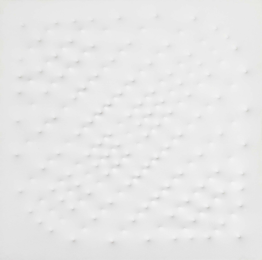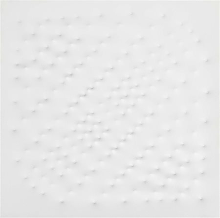 Enrico Castellani, Castelmassa (Ro) 1930, Superficie bianca, 1998, Acrilico su tela, cm. 70x70, Firma, titolo e data al verso sul risvolto della tela: Castellani - Superficie bianca - 1998., Certificato su foto Archivio Castellani, Milano, con n. 98-013 (con indicazione di autentica del 26-10-98).,