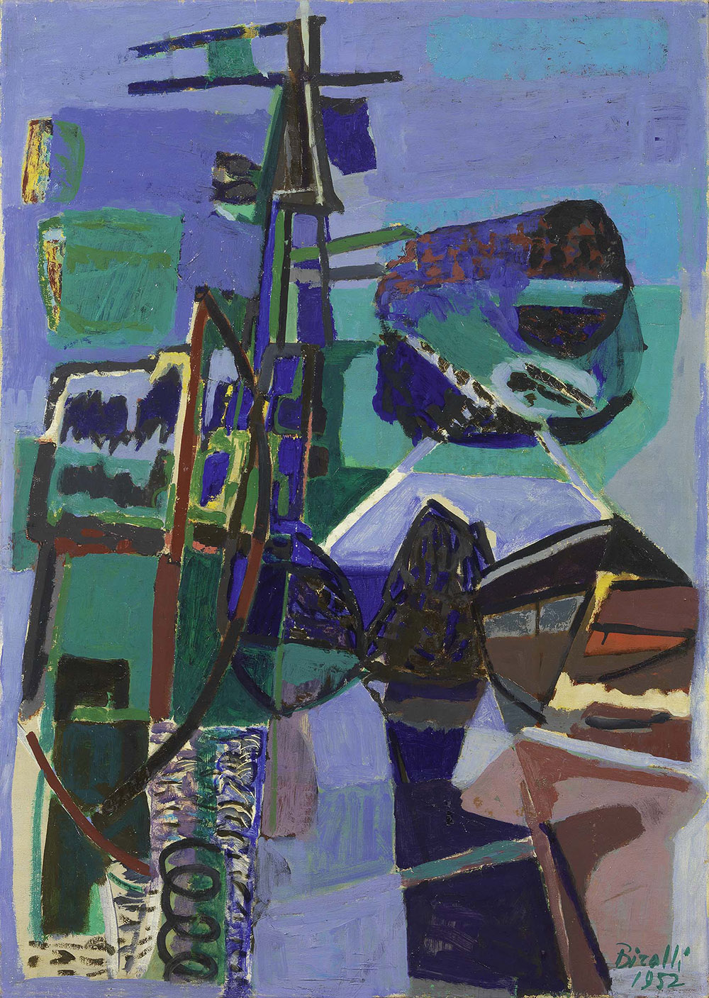 Renato Birolli, Verona 1905 - Milano 1959, Verde e blu per la Liguria, 1952, Olio su tela, cm. 92,5x65,5, , Firma e data in basso a destra: Birolli / 1952; firma al verso sulla tela: Renato Birolli / Milano; titolo e data al verso sul telaio: Verde e blù per la Liguria - 1952 - Agosto: etichetta parzialmente abrasa Soprintendenza alla Galleria Nazionale d'Arte Moderna / [Maestri] Moderni Collezione Cavellini / Maggio - Luglio 1957: etichetta La Nuova Città Galleria d'Arte Contemporanea, Brescia, con n. 500: etichetta con timbro Direzione Civici Musei Ferrara: etichetta Mostre d'Arte della Città di Verona / Renato Birolli 1931 - 1958: due etichette, di cui una con n. 145, XXX Biennale Internazionale d'Arte di Venezia 1960: etichetta Städtische Kunsthalle Mannheim / Renato Birolli / Ausstellung 27.6. - 26.7 1959: etichetta The Arts Coucil of Great Britain / London / Exhibition Contemporary Italian Art, con n. 11., , Storia, Collezione G.A. Cavellini, Brescia;, Collezione privata, , Esposizioni, XXX Biennale Internazionale d'Arte, Venezia, 1960, sala V, cat. p. 33, n. 20., , Bibliografia, Giuseppe Marchiori, Zeno Birolli, Franco Bruno, Renato Birolli, Edizioni Di Comunità, Milano, 1963, p. 82, n. 56;, Zeno Birolli, Renato Birolli, Feltrinelli Editore, Milano, 1978, p. 273, n. 1952.18 (541)., ,