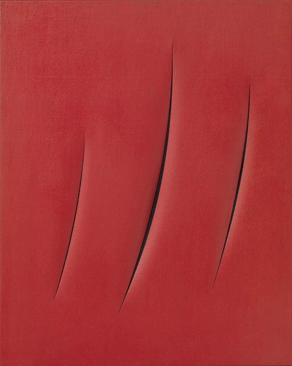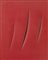 Lucio Fontana, Rosario Santa Fè 1899 - Varese 1968, Concetto spaziale, Attese, 1961, Idropittura su tela, rosso, cm. 92x73, , Firma, titolo e scritta al verso sulla tela: l. Fontana / Concetto spaziale "ATTESE" / 1+1 - 731A: etichetta Galleria Pogliani, Roma, con n. 0608; sul telaio: cartiglio con indicazione di proprietà Dolly Bright Carter, Los Angeles: etichetta Santa Barbara Museum of Art: etichetta Howard Arnold Pictur, Beverly Hills, California., , Storia, Galleria Pogliani, Roma;, Collezione Dolly Bright Carter, Los Angeles;, Collezione privata, Londra;, Asta Sotheby's, Londra, 3 dicembre 1987, n. 659;, Collezione privata, , Esposizioni, Lucio Fontana. Un maestro e le sue tecniche, Cortina d'Ampezzo, Galleria d'Arte Frediano Farsetti, 26 dicembre 2005 - 6 gennaio 2006; poi Milano, Farsettiarte, 1 - 28 febbraio 2006, cat. n. 42, illustrato a colori., , Bibliografia, Enrico Crispolti, Lucio Fontana. Catalogo ragionato di sculture, dipinti, ambientazioni, tomo II, con la collaborazione di Nini Ardemagni Laurini, Valeria Ernesti, Skira editore, Milano 2006, p. 627, n. 61 T 101., ,