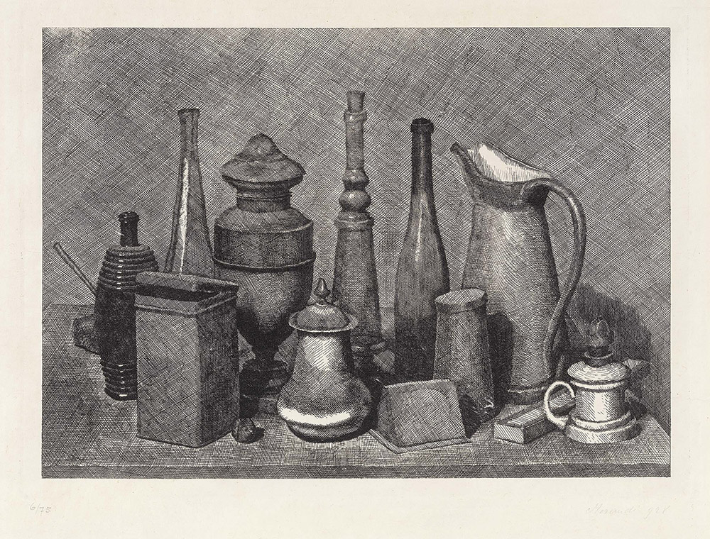 Giorgio Morandi, Bologna 1890 - 1964, Grande natura morta con la lampada a destra, 1928, Acquaforte su rame, su carta Giappone, es. 6/75, cm. 25,2x34,9 (lastra), cm. 42x46,3 (carta), , Firma e data a matita sul margine in basso a destra: Morandi 928, tiratura in basso a sinistra: 6/75: timbro a secco GM; al verso: firma Mariateresa Morandi., , Ottavo stato su otto; tiratura di 75 esemplari numerati su carta Giappone e tre prove di stampa., , Bibliografia, Lamberto Vitali, L'opera grafica di Giorgio Morandi, Giulio Einaudi Editore, Torino, 1964, n. 46;, Michele Cordaro, Morandi incisioni. Catalogo Generale, Edizioni Electa, Milano, 1991, p. 53, n. 1928 6., ,