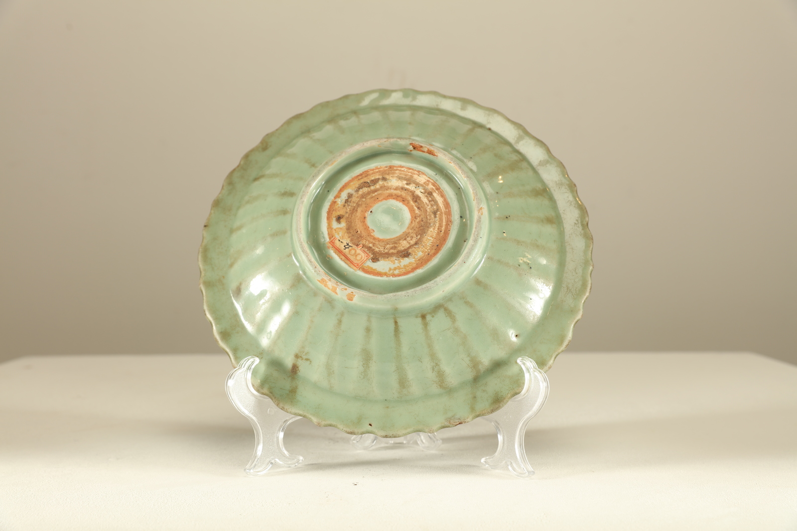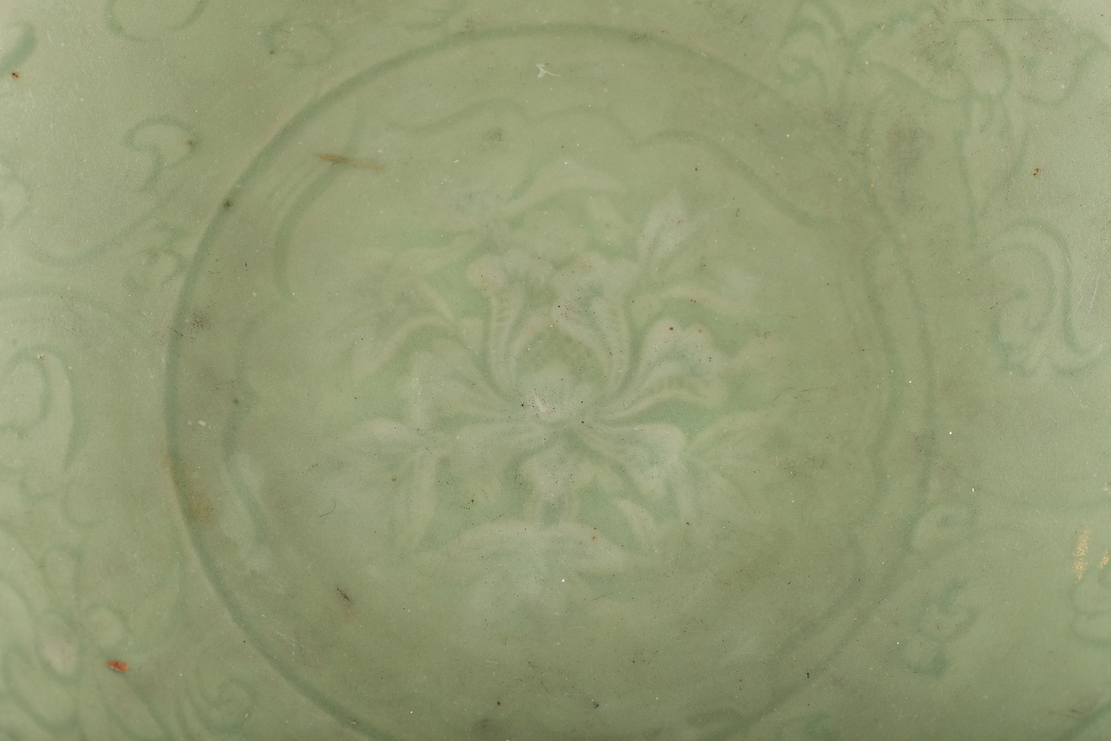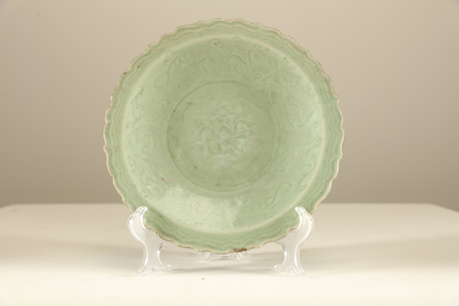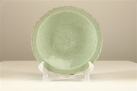Arte Cinese Piatto in ceramica celadon con bordo lobato ed inciso con motivo di peonie