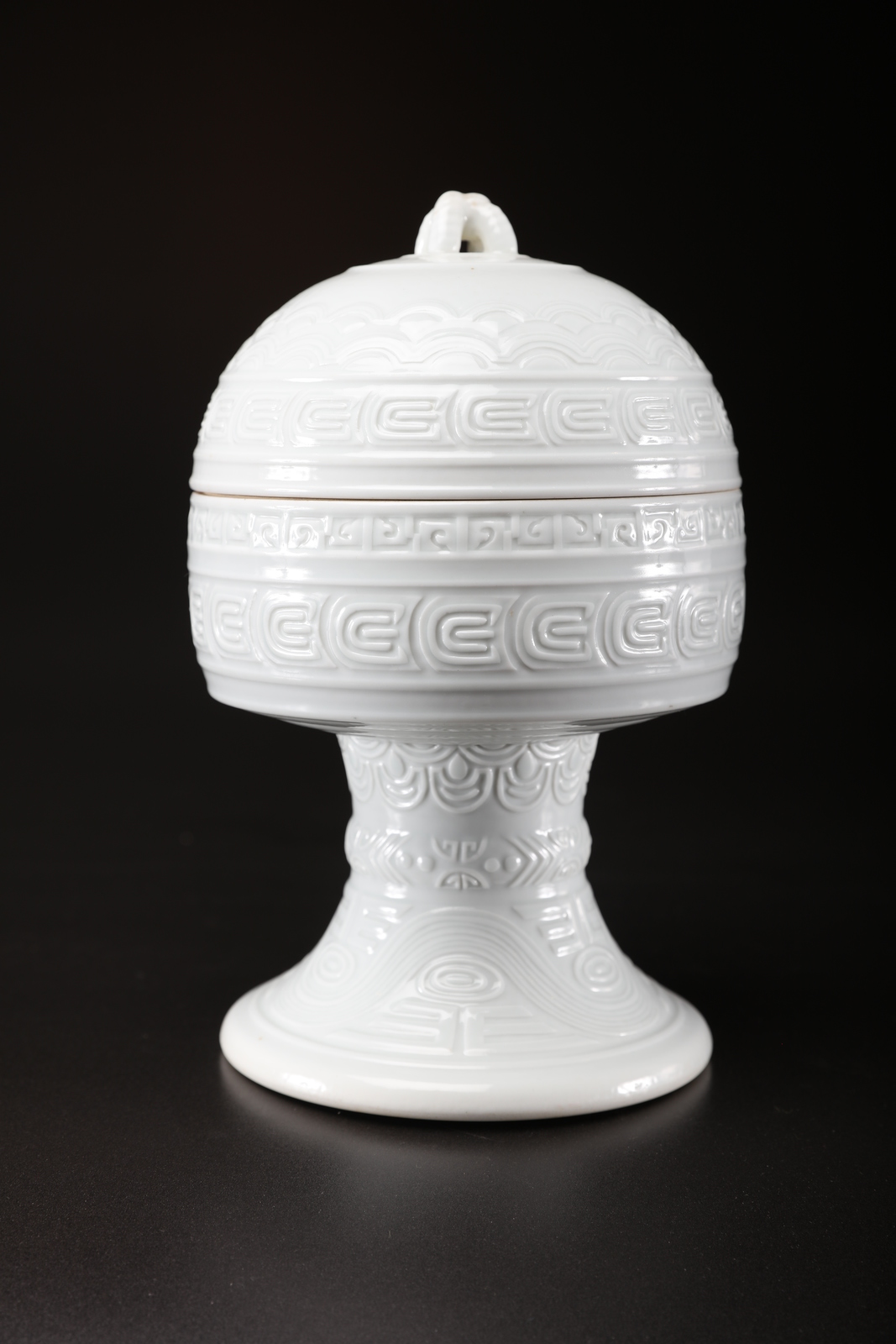 Arte Cinese An imperial white glazed "dou" altar vessel and cover with Qianlong six characters seal mark at the base China, Qing dynasty. . Cm 26,00.