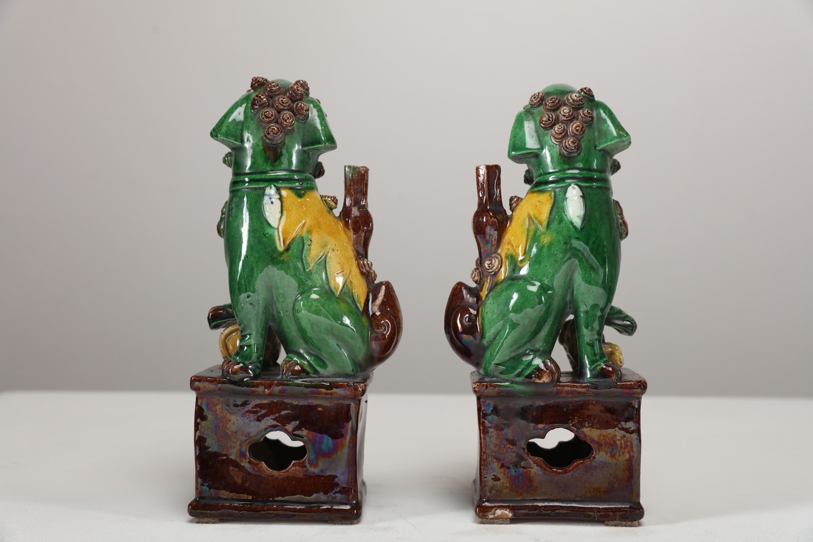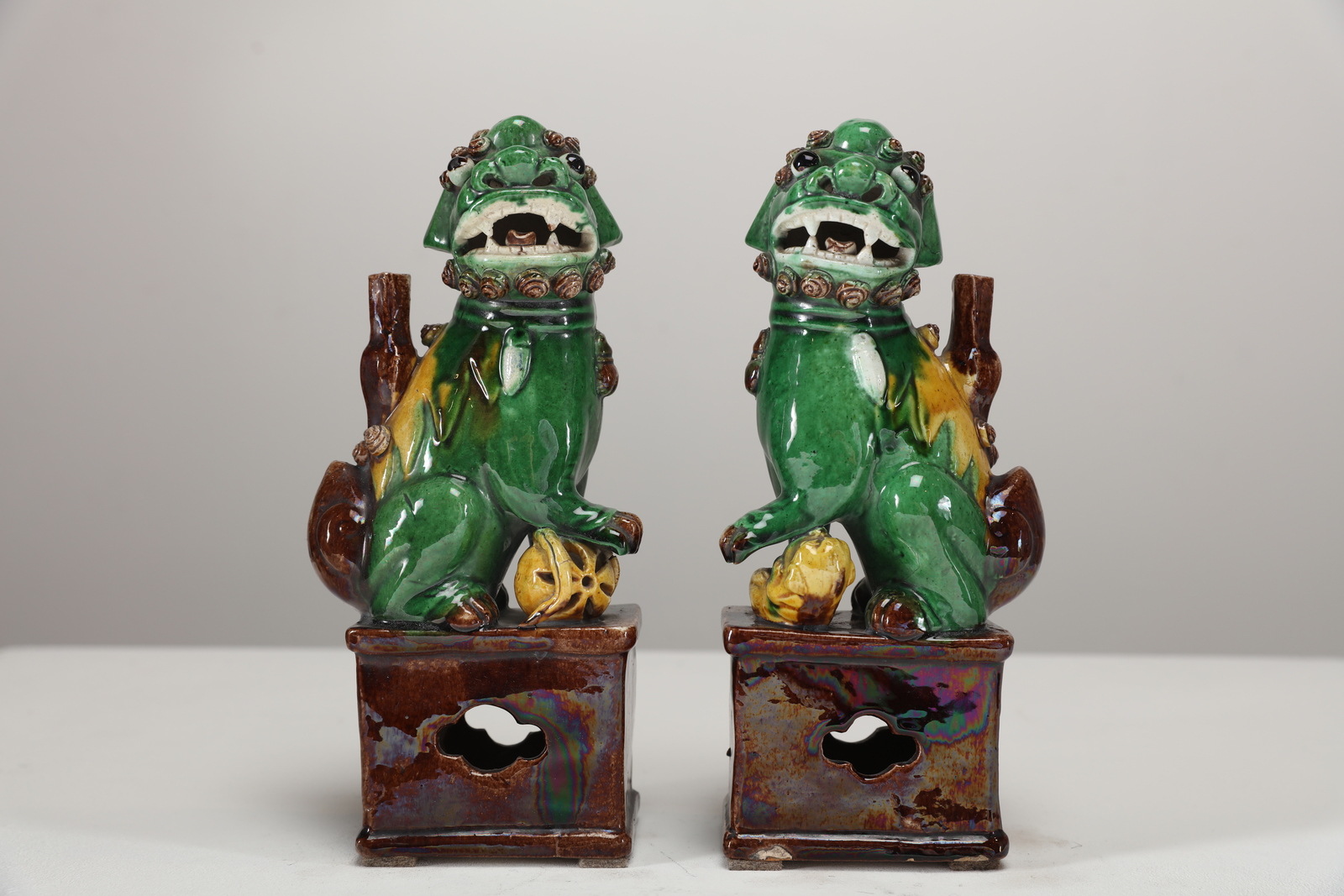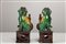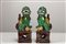 Arte Cinese Coppia di cani di pho in porcellana smaltata di verde, giallo e marrone