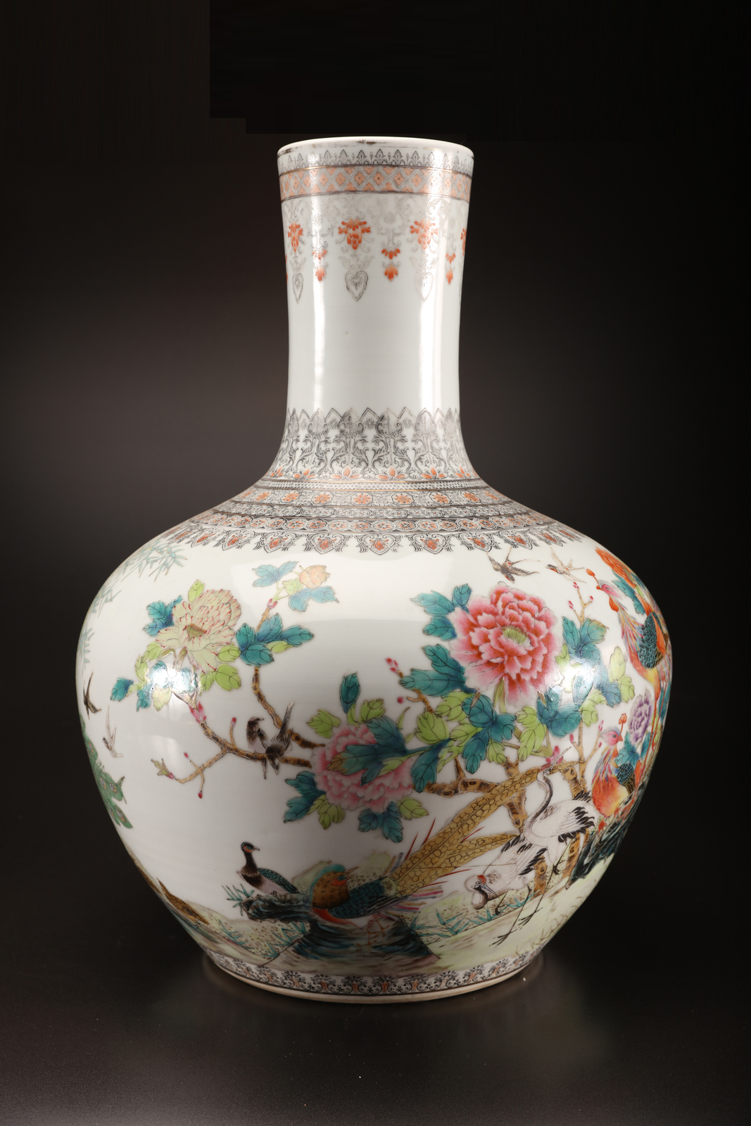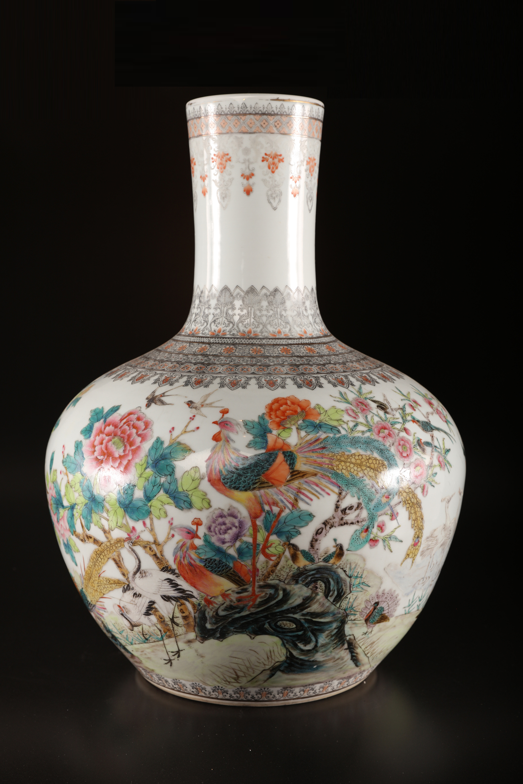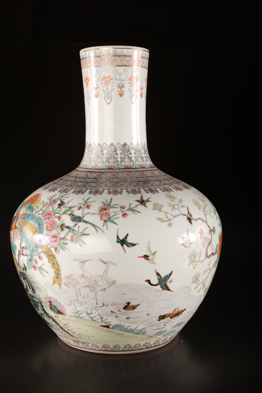 Arte Cinese A massive porcelain vase painted with birds among blossoming branches and bearing a mark at the base