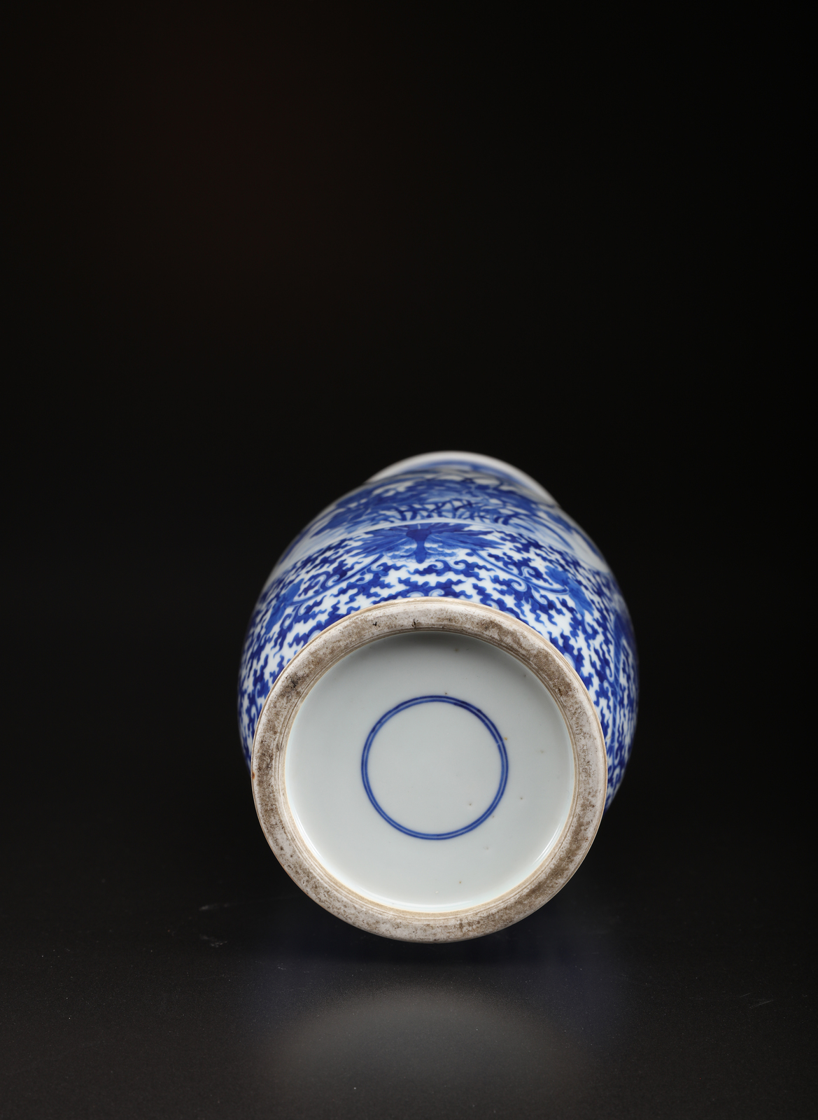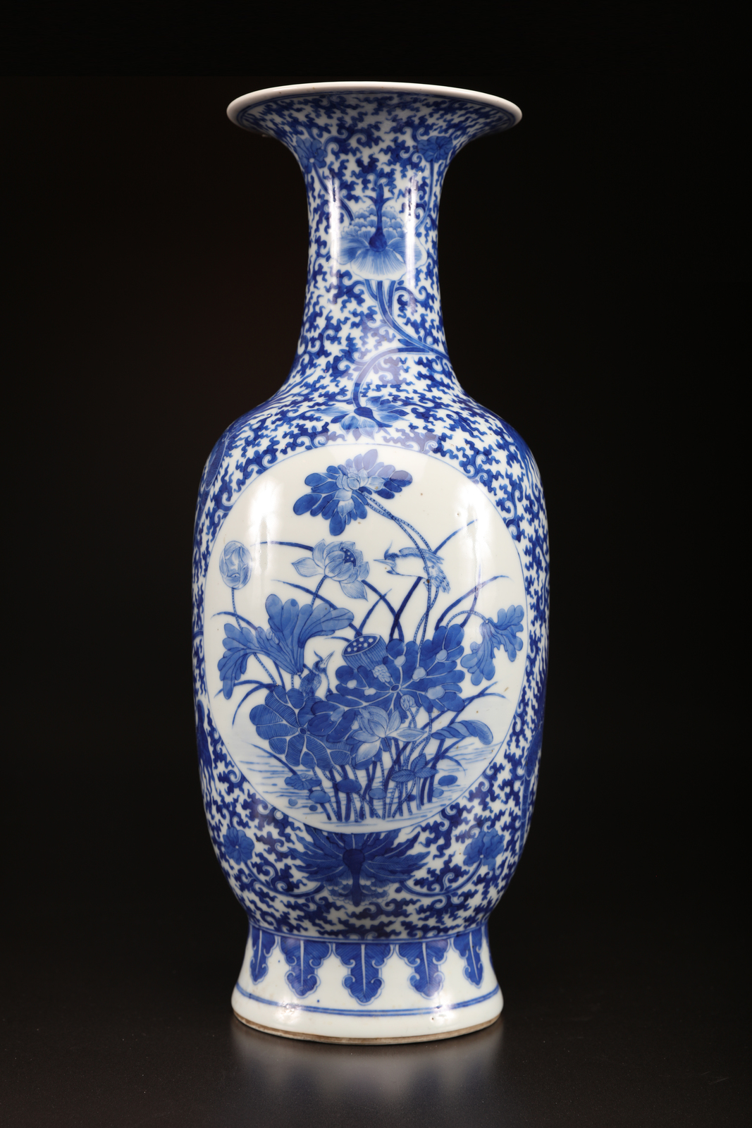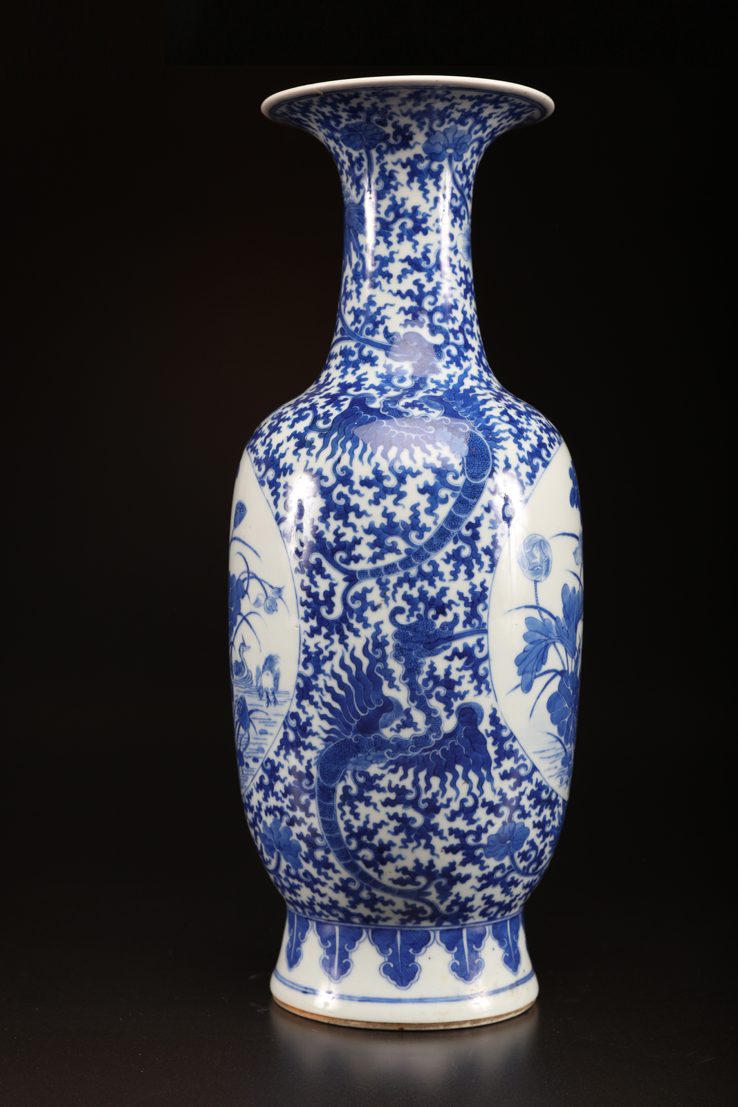 Arte Cinese Porcelain blue and white baluster base painted with central oval reserve depicting a pound and bearing a Kangxi double circle reign mark at the base