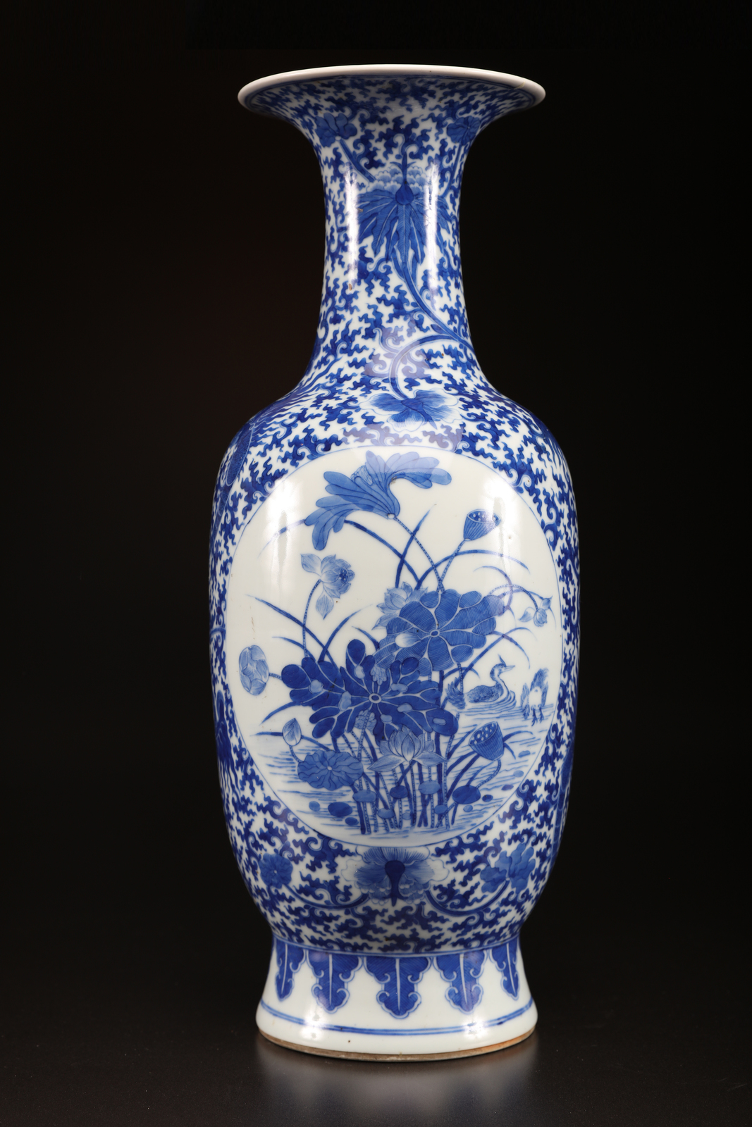 Cina, dinastia Qing, XIX secolo. . Cm 46,00. Poggiante su disco decorato con corona di teste di ruyi, il corpo centrale dipinto con due grandi riserve ovali raffiguranti papere in uno stagno caratterizzato da fiori di loto, ninfee e canne di bamboo. Il corpo e il collo estroflesso sono dipinti con nuvole, dragoni, motivi floreali e fiori. Marchio Kangxi a doppio cerchio sulla base.