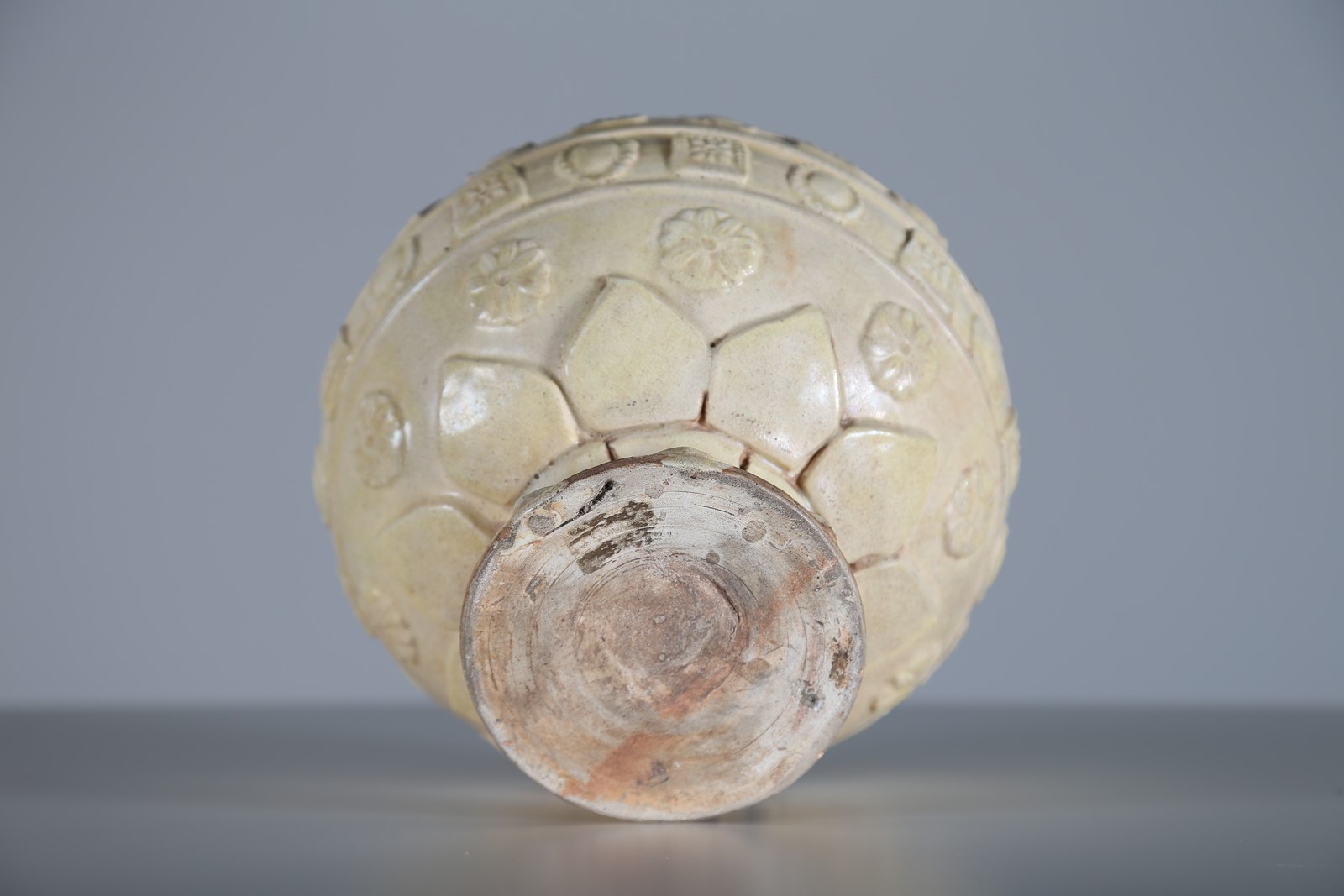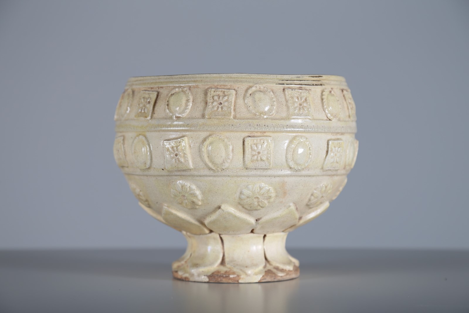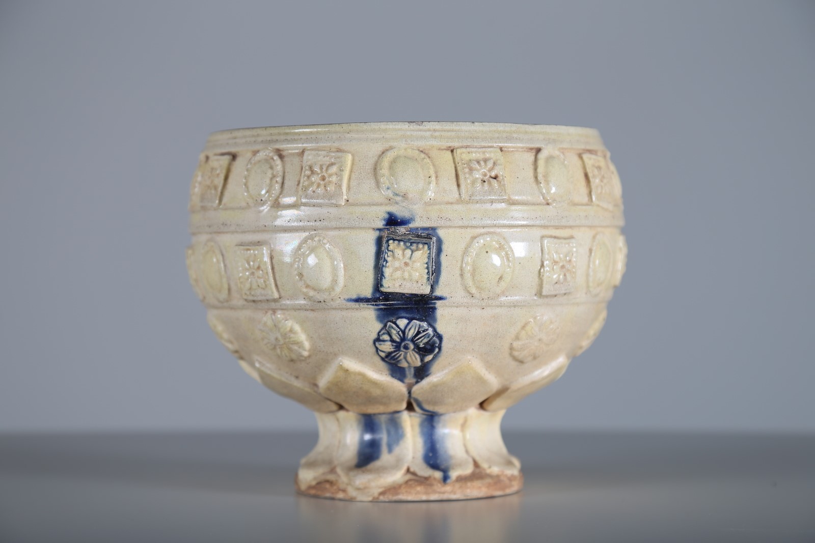 Cina, XIX secolo o antecedente. -. Cm 18,00 x 17,00. In terracotta invetriata nei colori sancai ed impressa con corona di petali sul piede circolare e due fasce con motivi floreali entro rettangoli alternati a cartucce ovali.