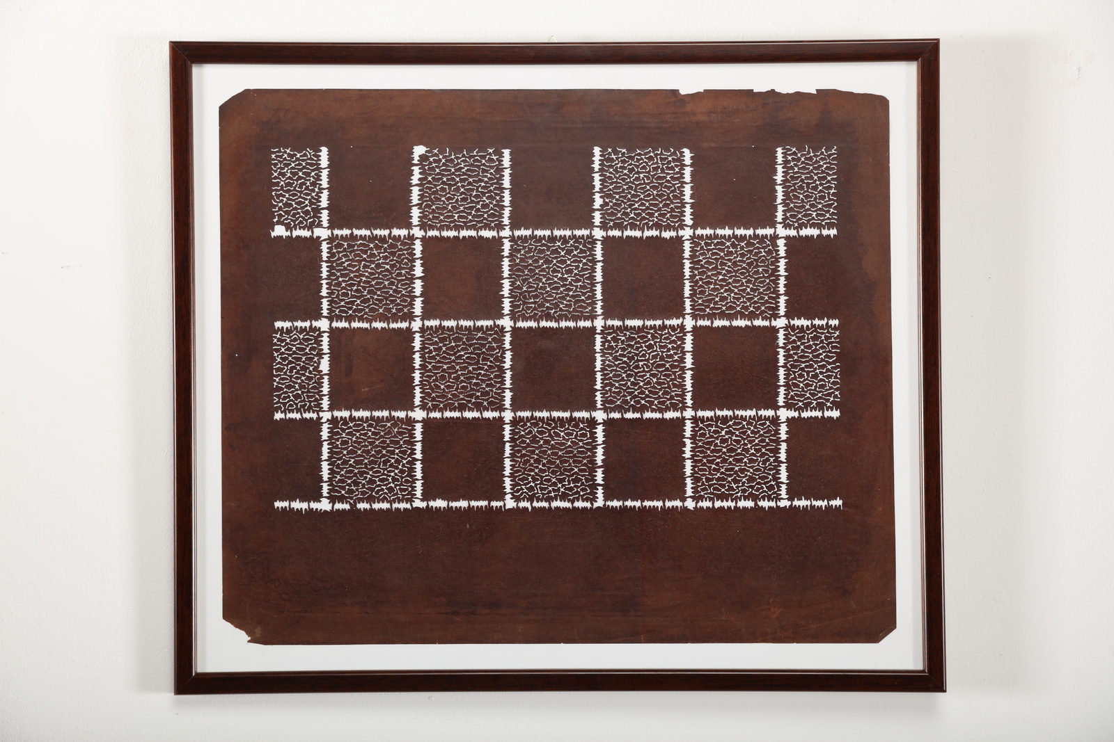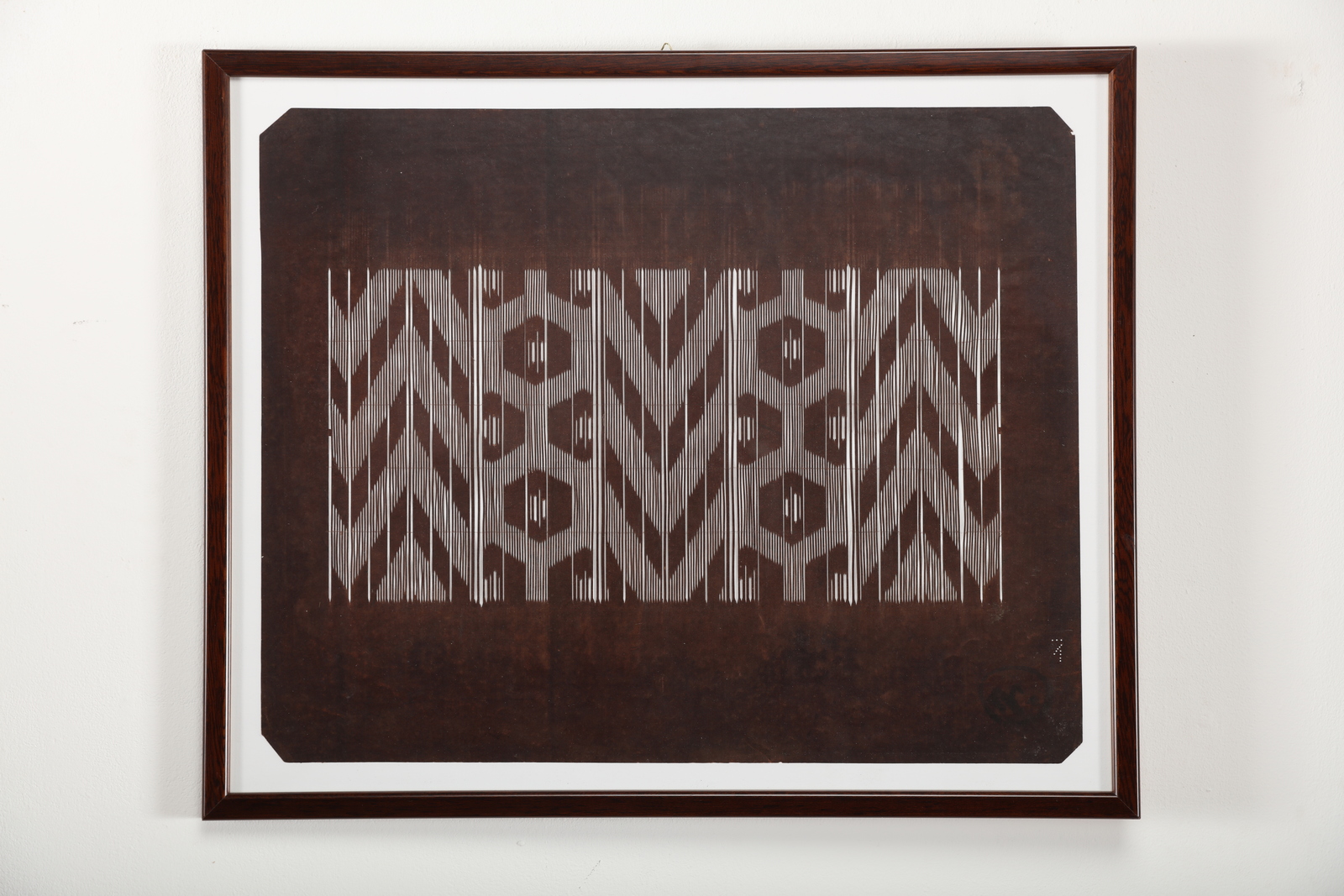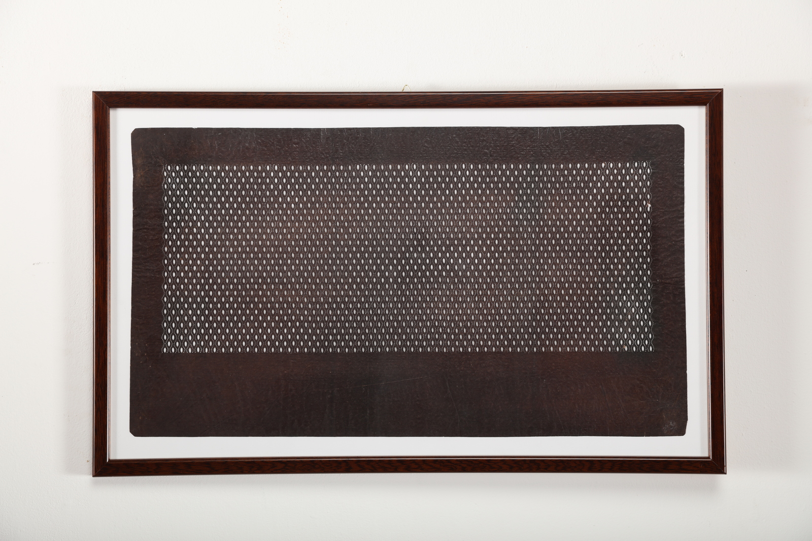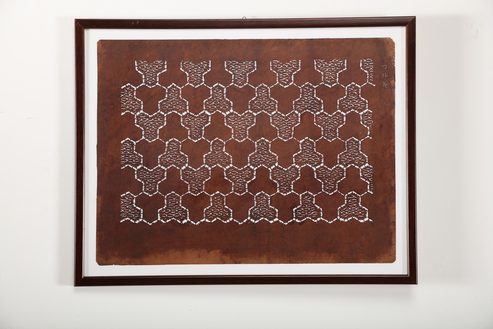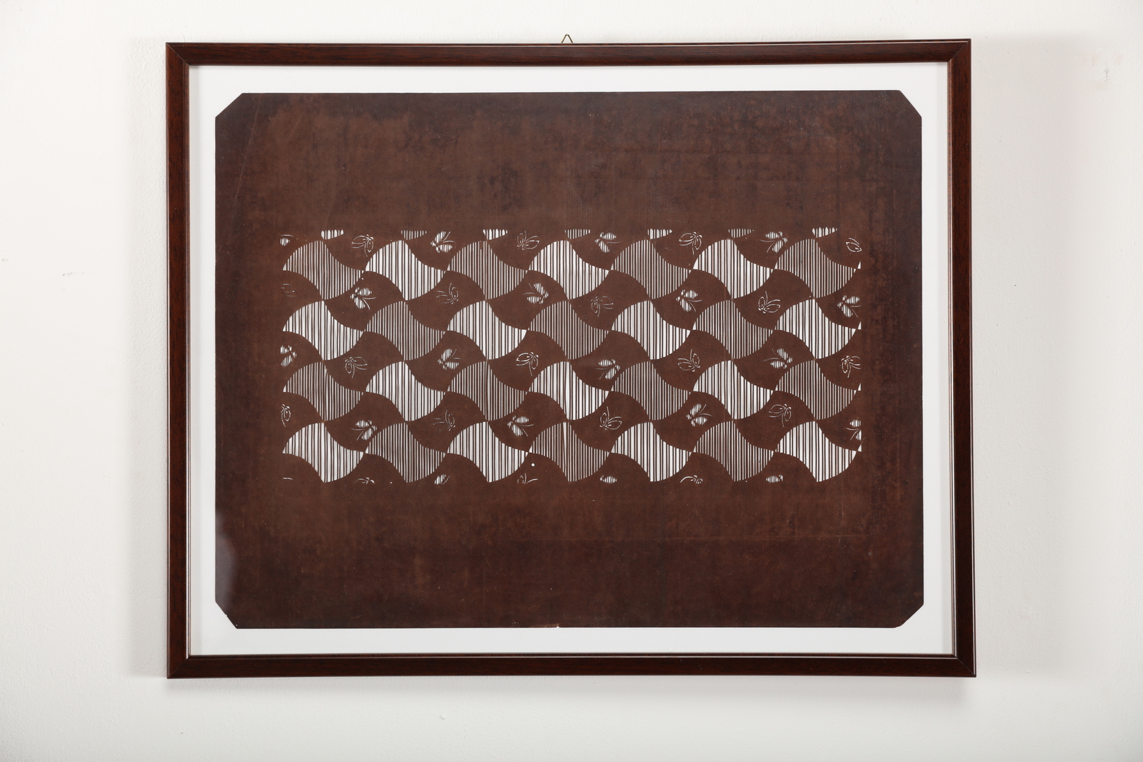 Giappone, periodo Edo, XIX secolo. . Cm 40,50 x 50,50. Caratterizzati da forme geometriche intrecciate e dall'alternanza tra pieni e vuoti, i katagami sono stampi per la tintura dei tessuti dell'epoca Edo e sono tutt'ora prodotti utilizzando fogli di carta ottenuta dalla lavorazione della corteccia di gelso sovrapposti, bagnati nel succo fermentato di cachi -che conferisce il caratteristico colore marrone-, lasciati essiccare al sole ed in seguito intagliati a formare decori vegetali o geometrici, come negli esemplari qui proposti.