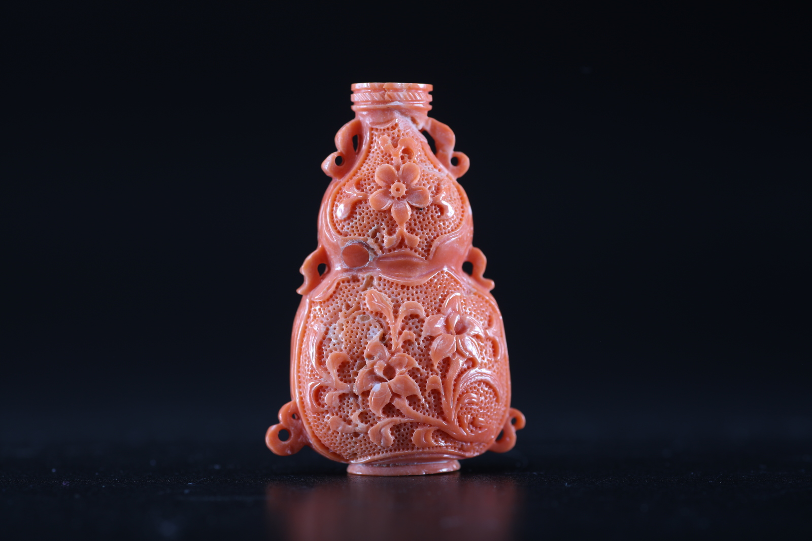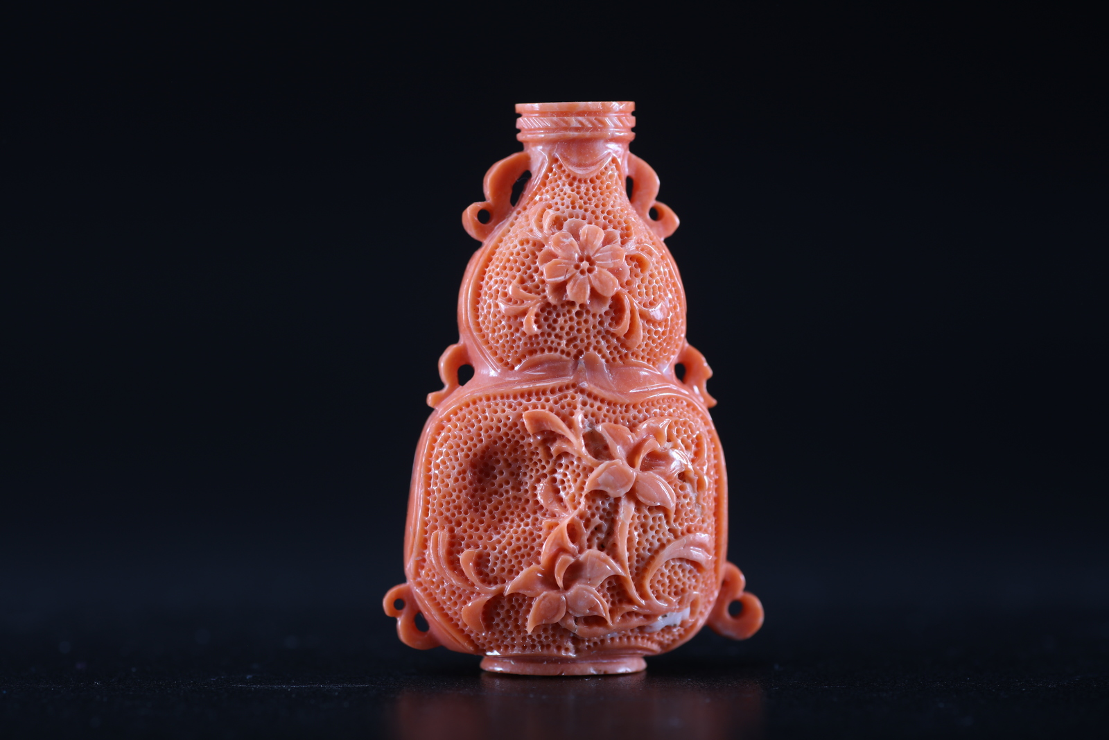 Arte Cinese A coral snuff bottle carved with floral decor.
