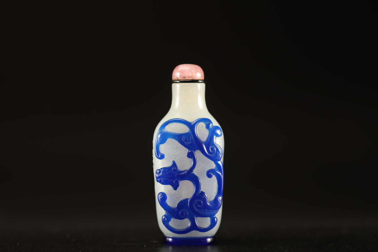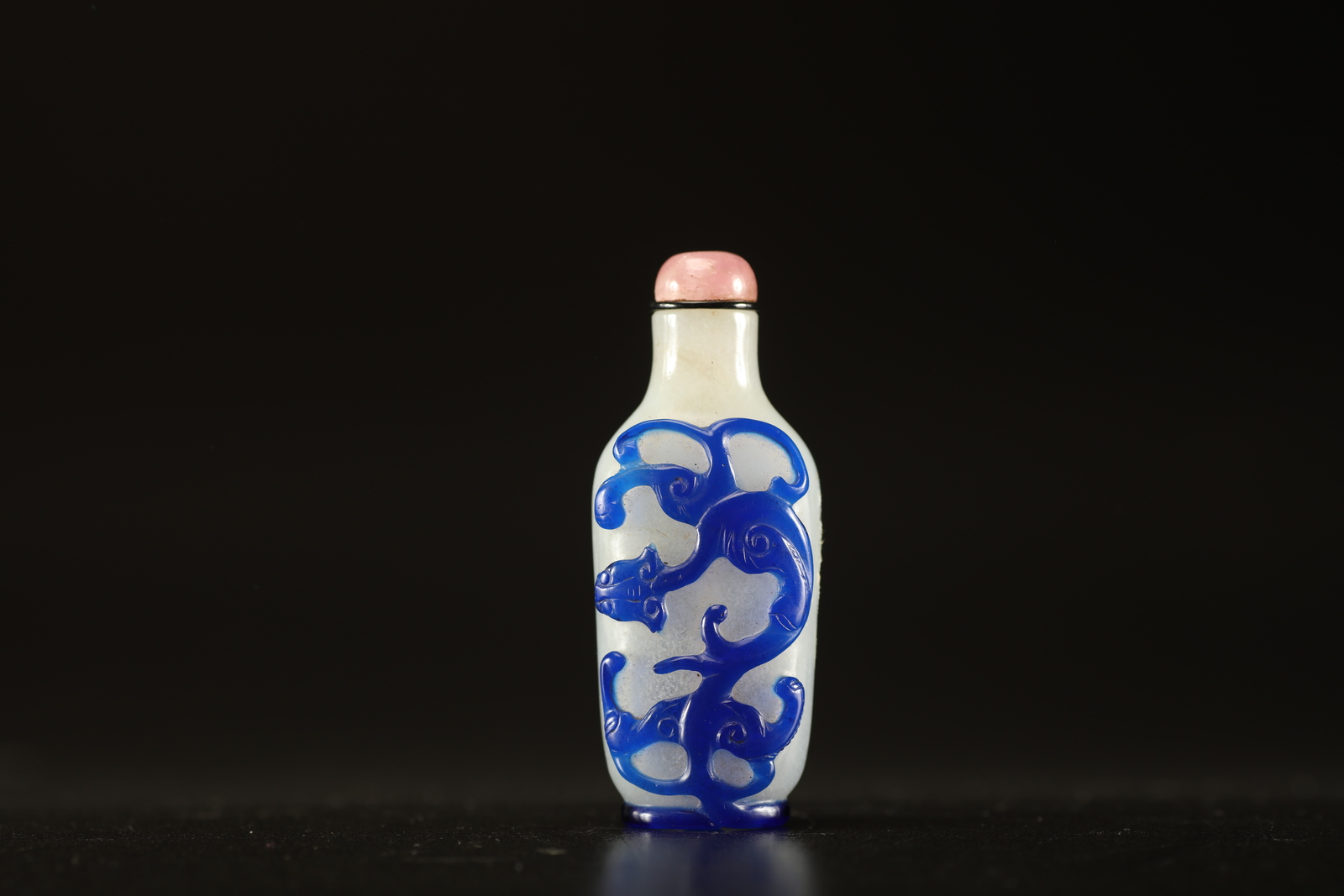 Arte Cinese Tabacchiera in vetro con decoro di chilong in vetro cammeo blu e tappo in quarzo