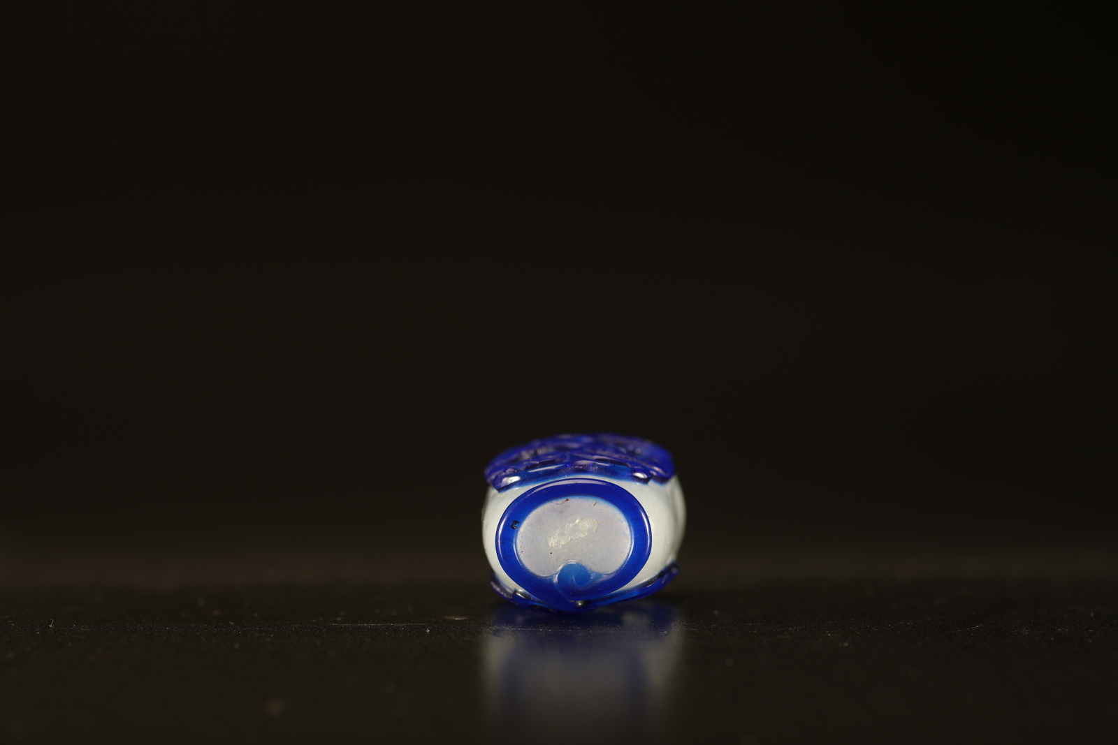 Arte Cinese Glass snowstorm snuff bottle with blue overlay decor of chilongs and quarz stopper