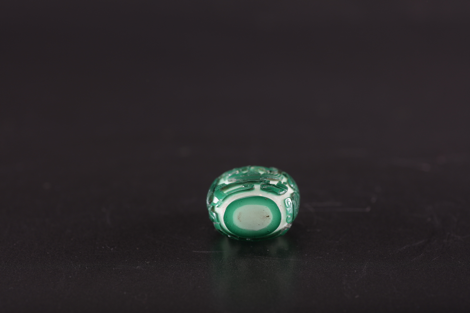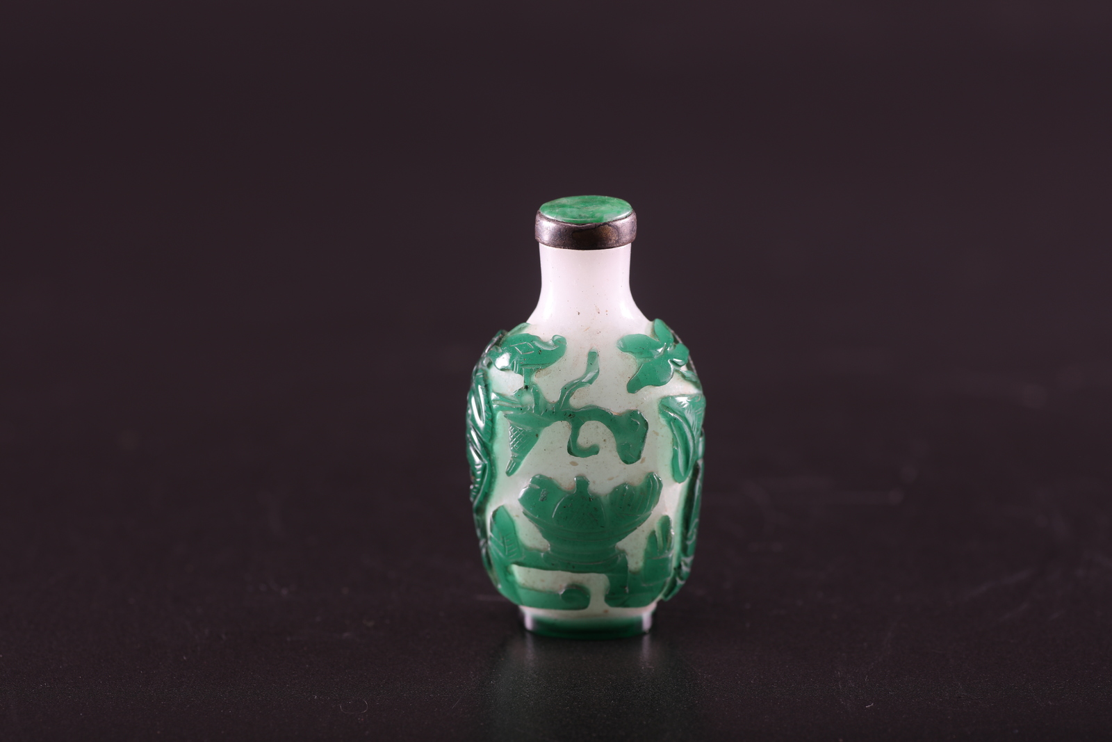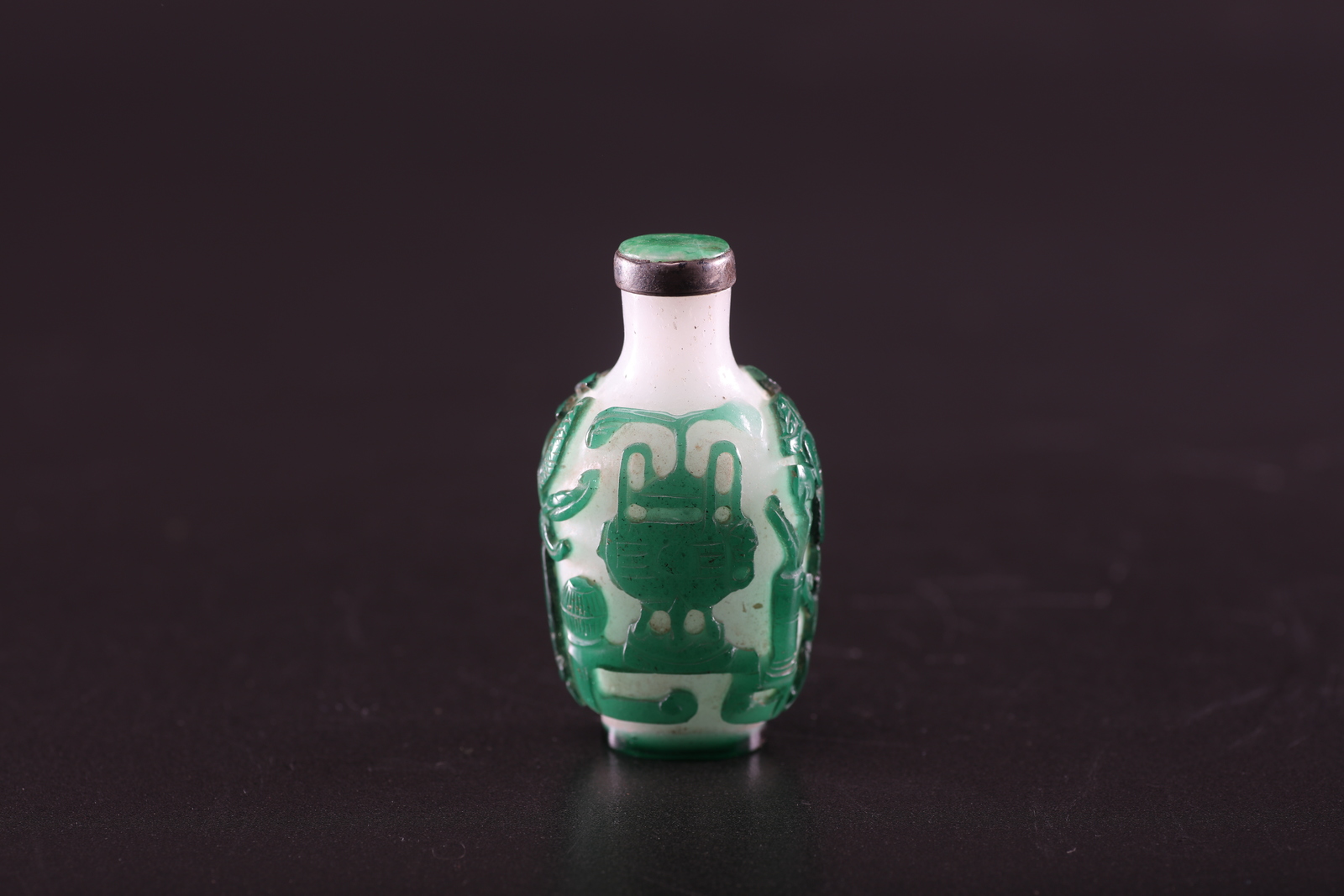Arte Cinese A glass snuff bottle with overlay green glass decor of antiques