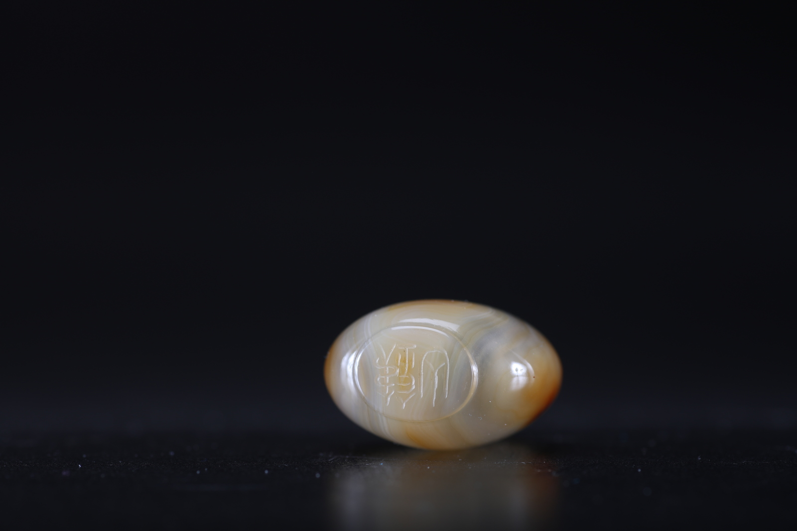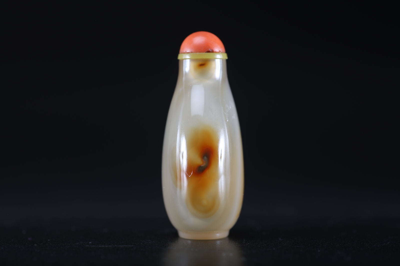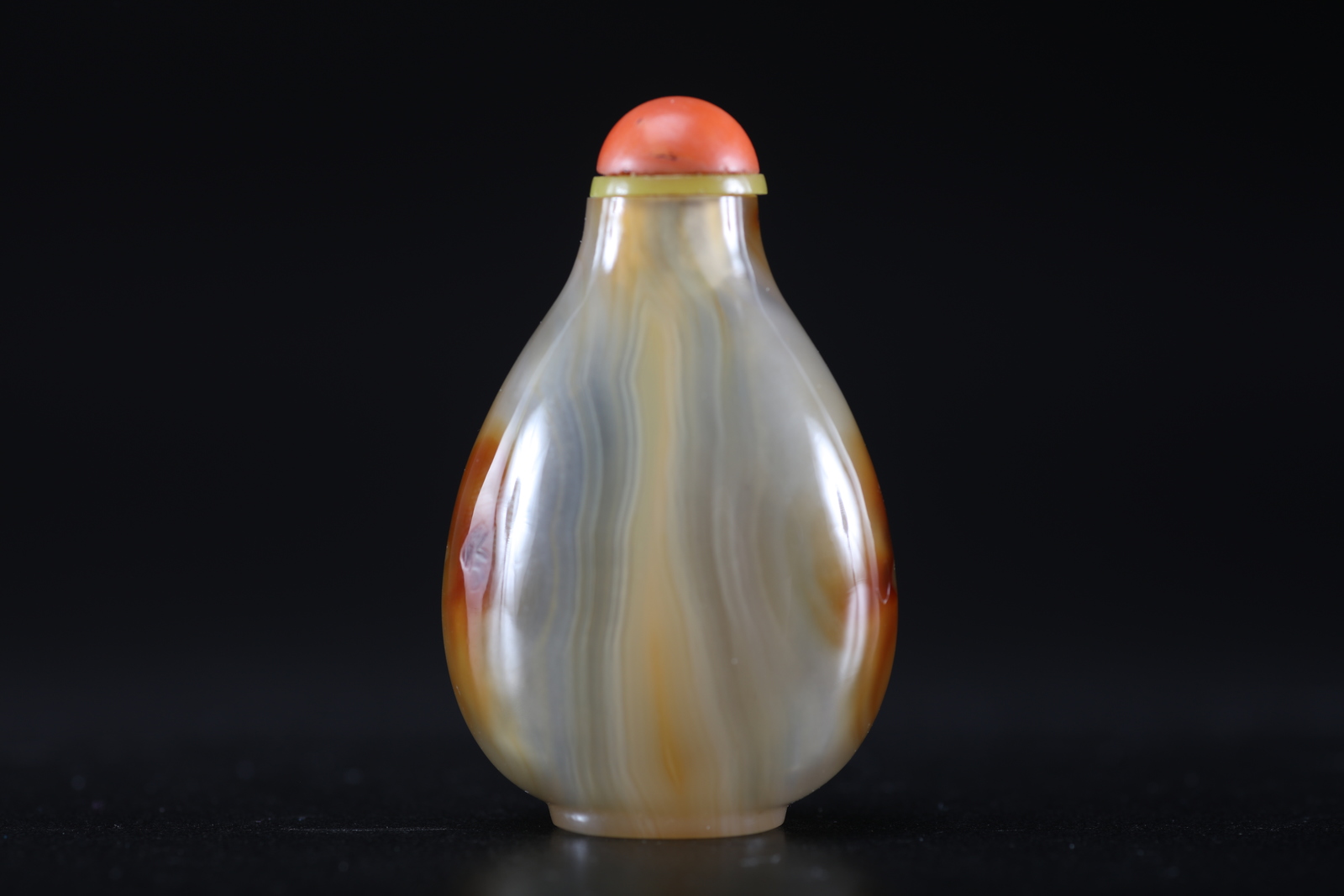 Arte Cinese Tabacchiera in agata decorata con le naturali venature che producono un effetto marmorizzato. Tappo in corallo. Cina, XVIII secolo. . Cm 5,80. Marchio inciso sotto la base.