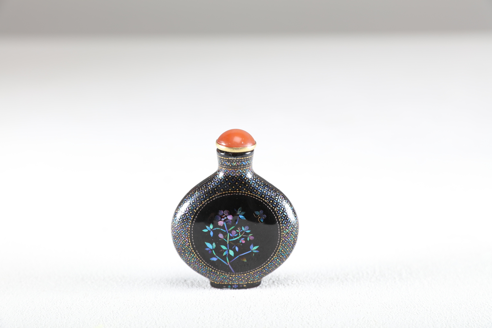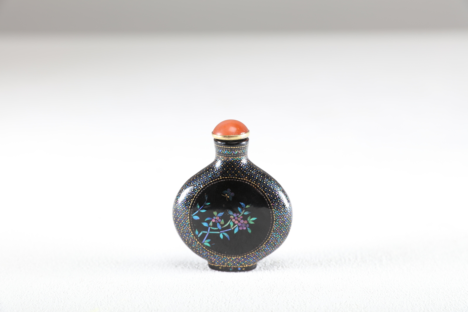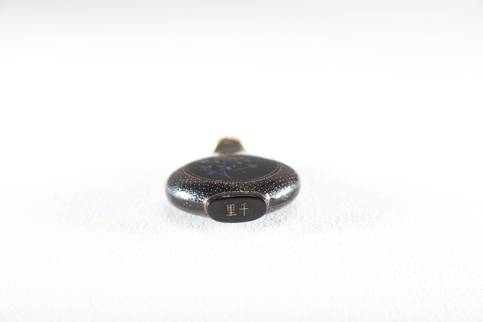 Arte Cinese A lacquer snuff bottle with mother-of-pearl floral inlays and bearing a mark at the base, signed by Li Qian