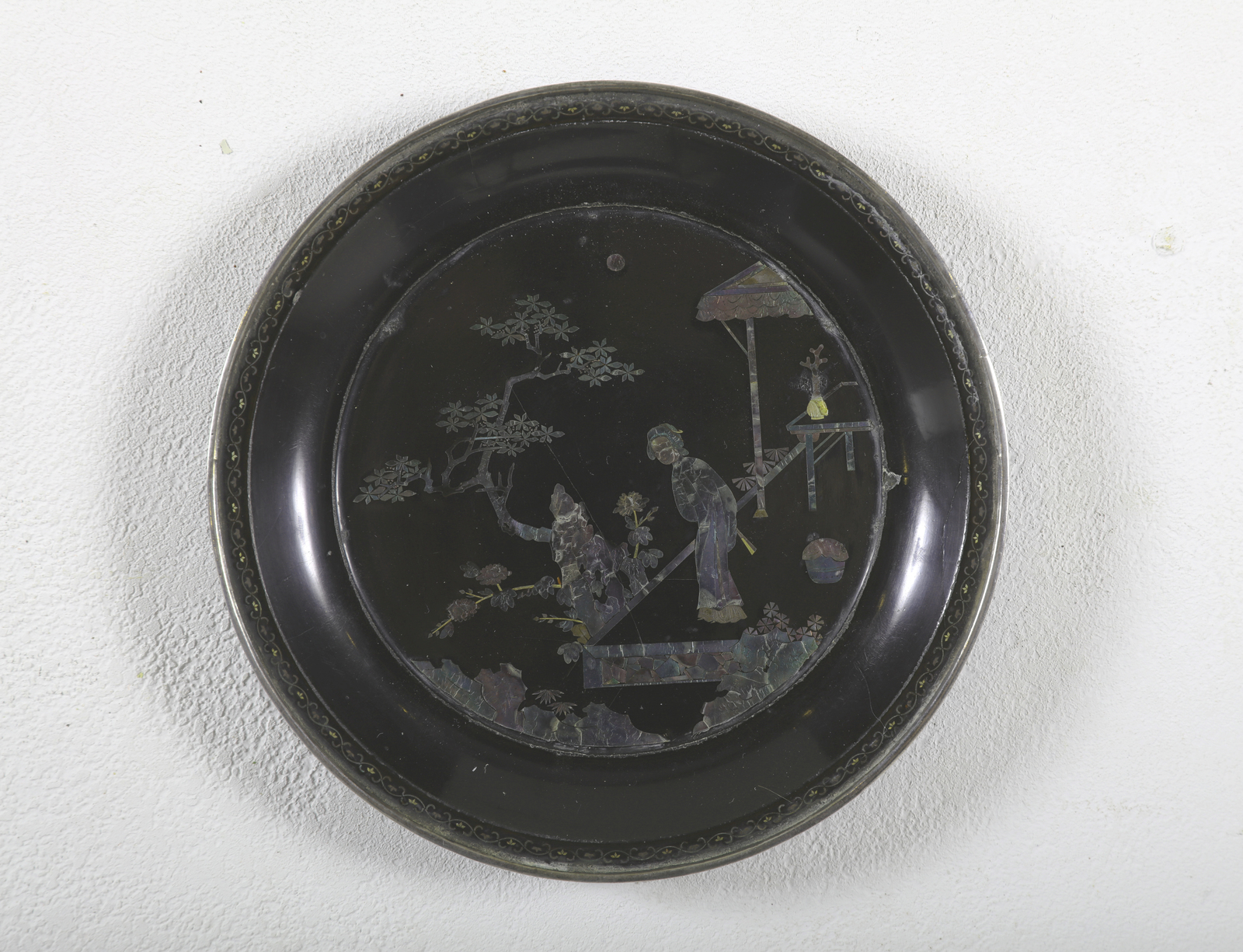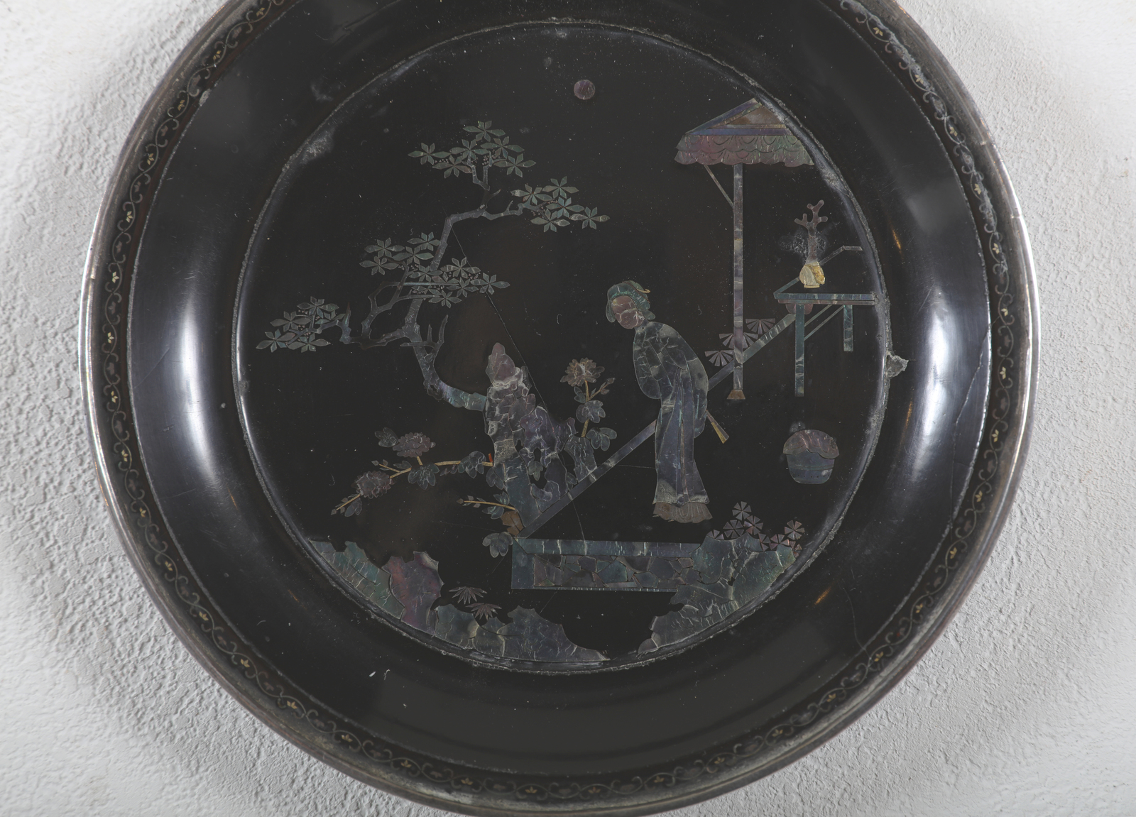 Arte Cinese A small lacquer dish with mother-of-pearl inlays depicting women in garden. Cartier metal mount band at the rim.