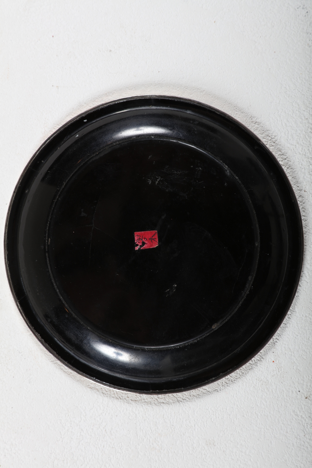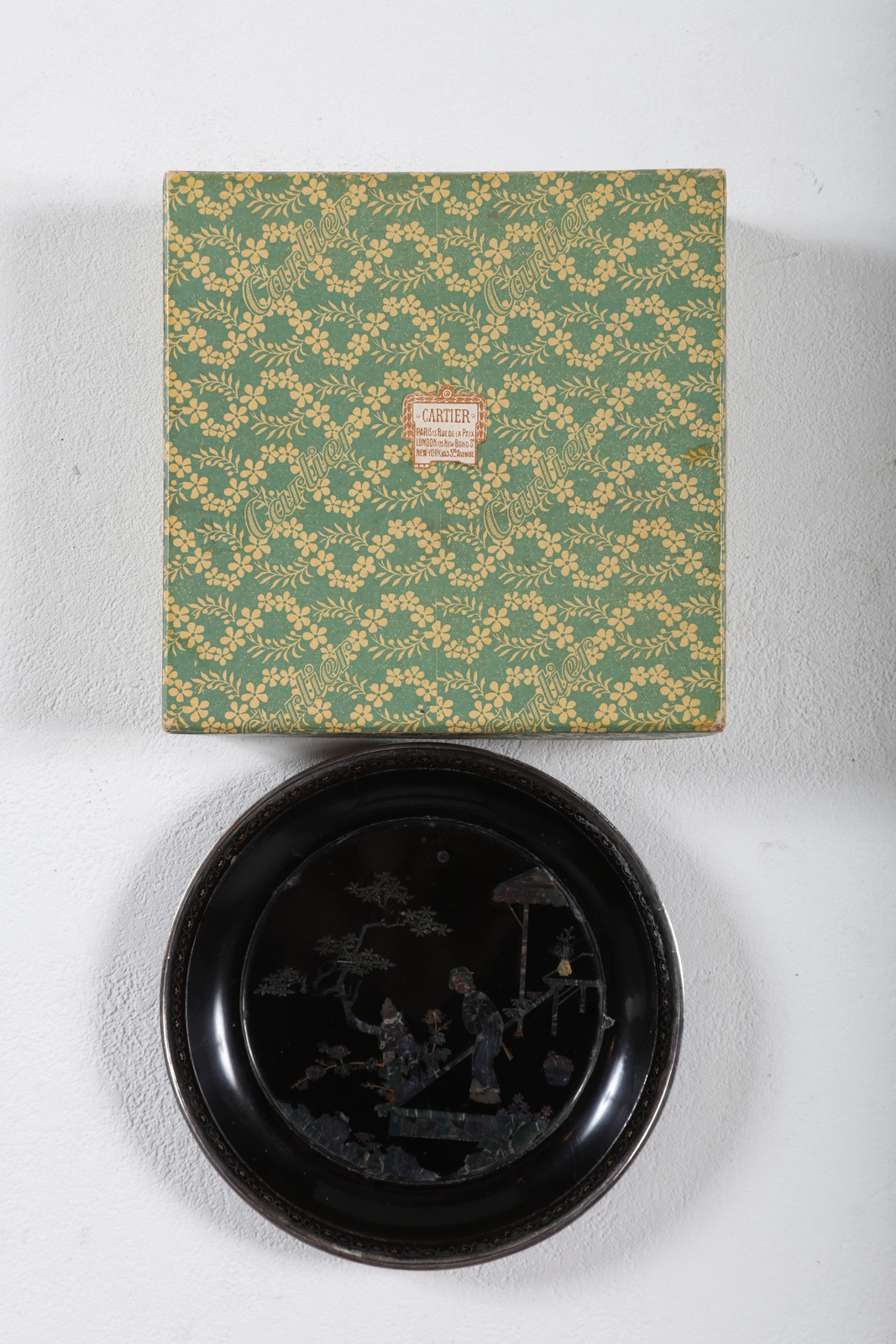 Arte Cinese Piattino in lacca burgoté intarsiato in madreperla con raffigurazione di dame in esterno e corredato di montatura Cartier
