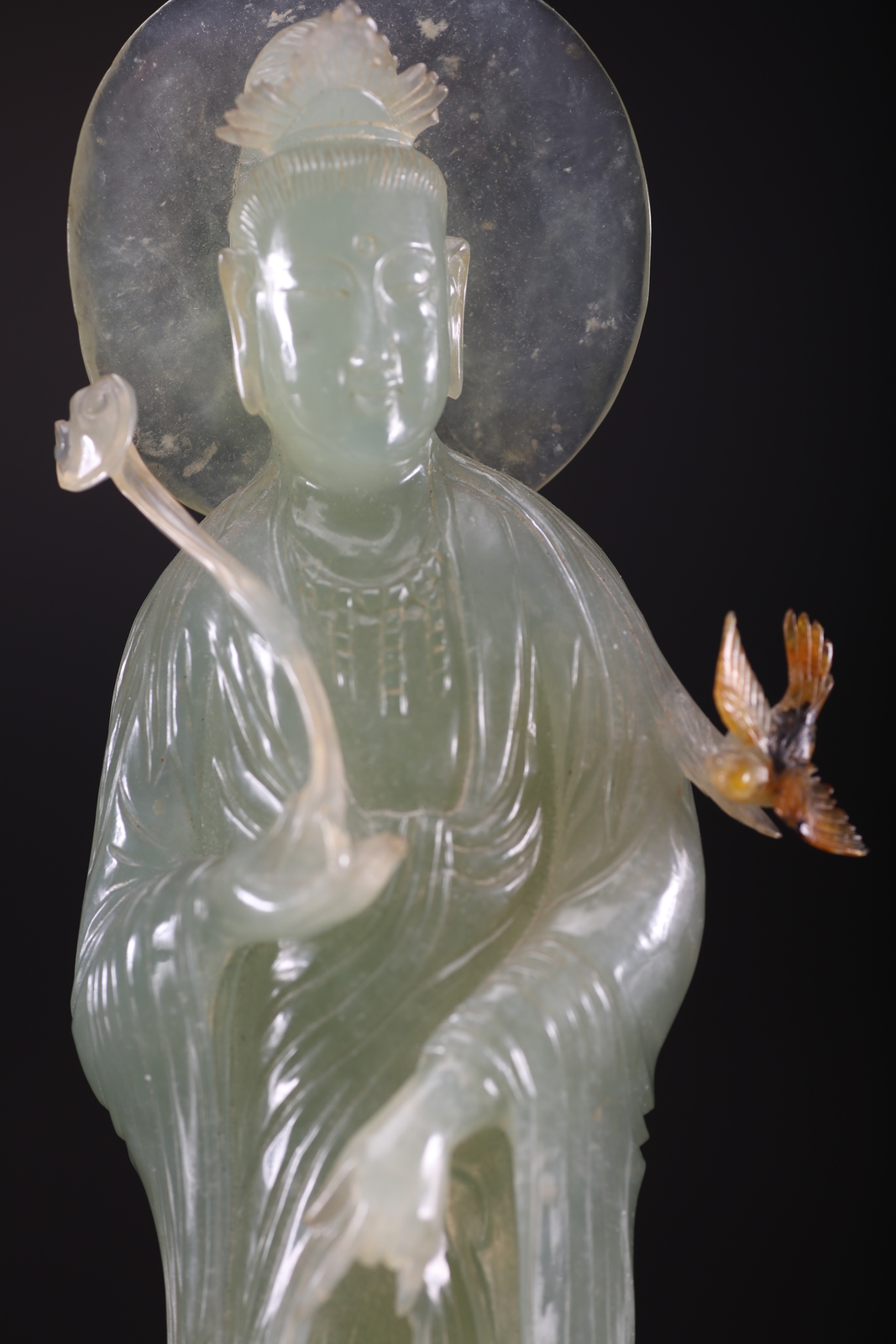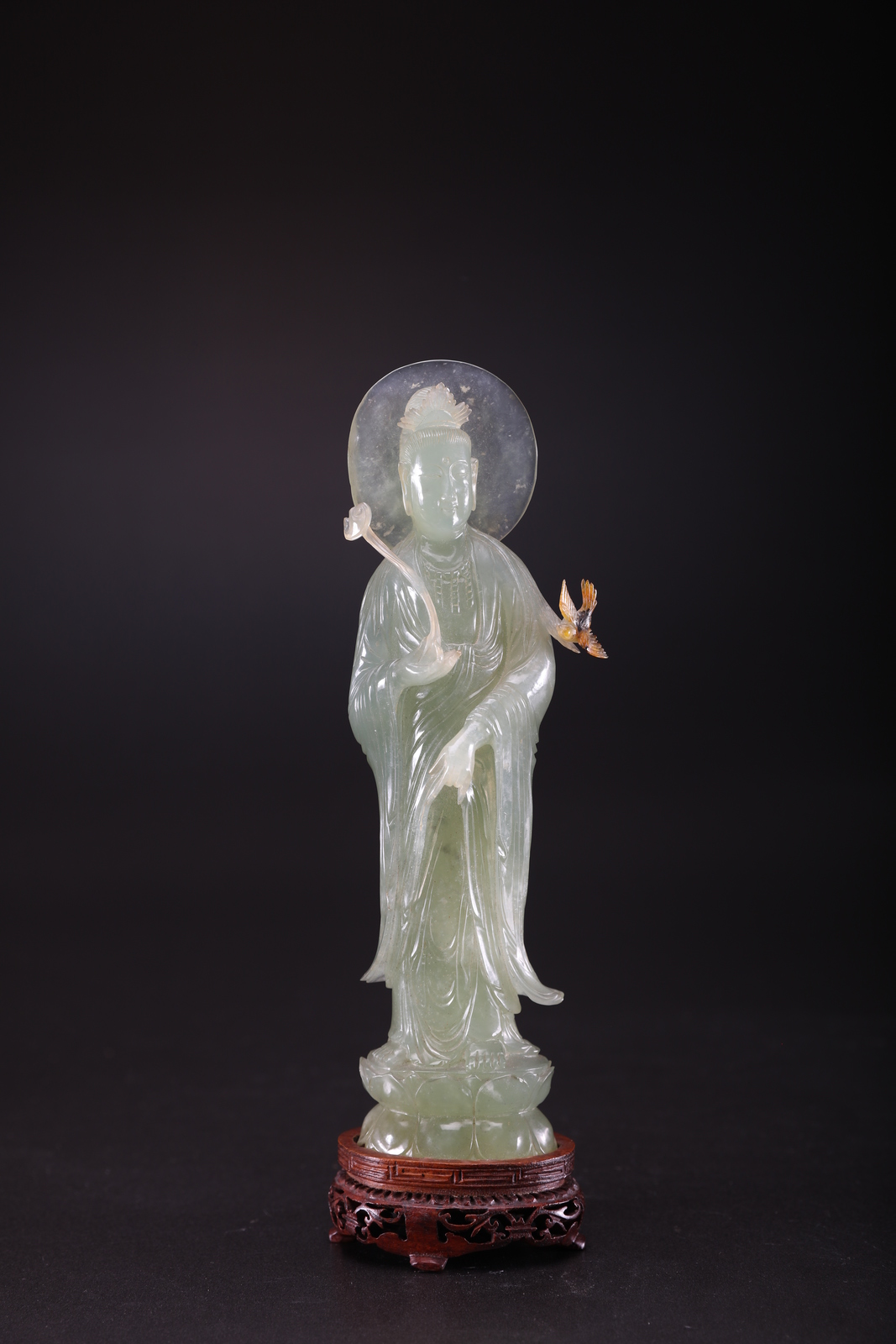Cina, XX secolo. -. Cm 7,50 x 26,00. Raffigurata in posizione stante su una base a doppio loto a sua volta poggiante su una base circolare in legno, la figura mostra ricche vesti, la consueta gioielleria sul petto, l'aureola circolare dietro la testa, uno scettro ruyi nella sua mano destra, mentre un uccello si posa sul braccio sinistro.