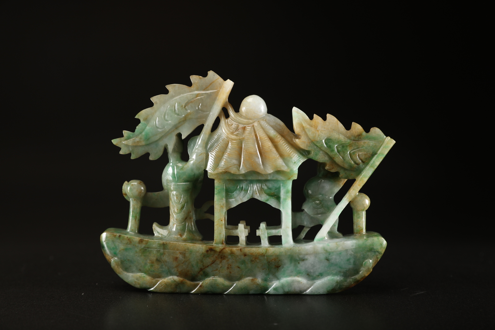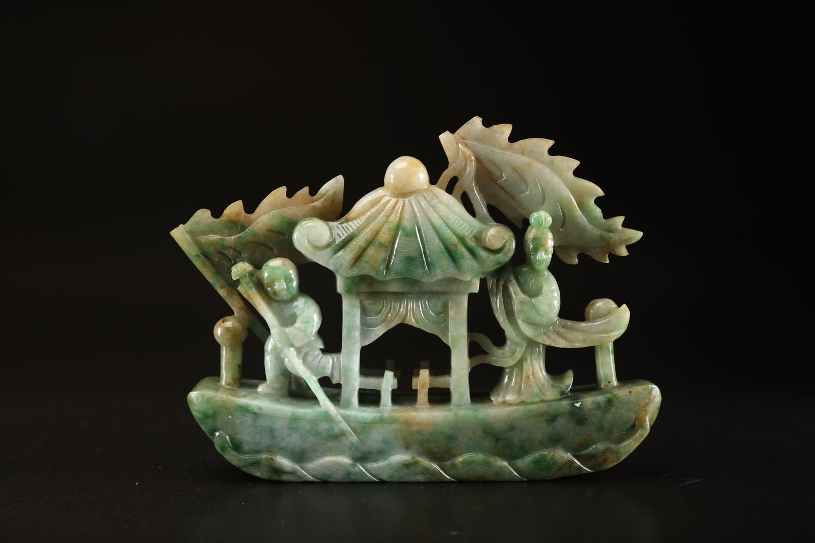 Arte Cinese A jadeite carved boat with a lady, a child and pagoda.