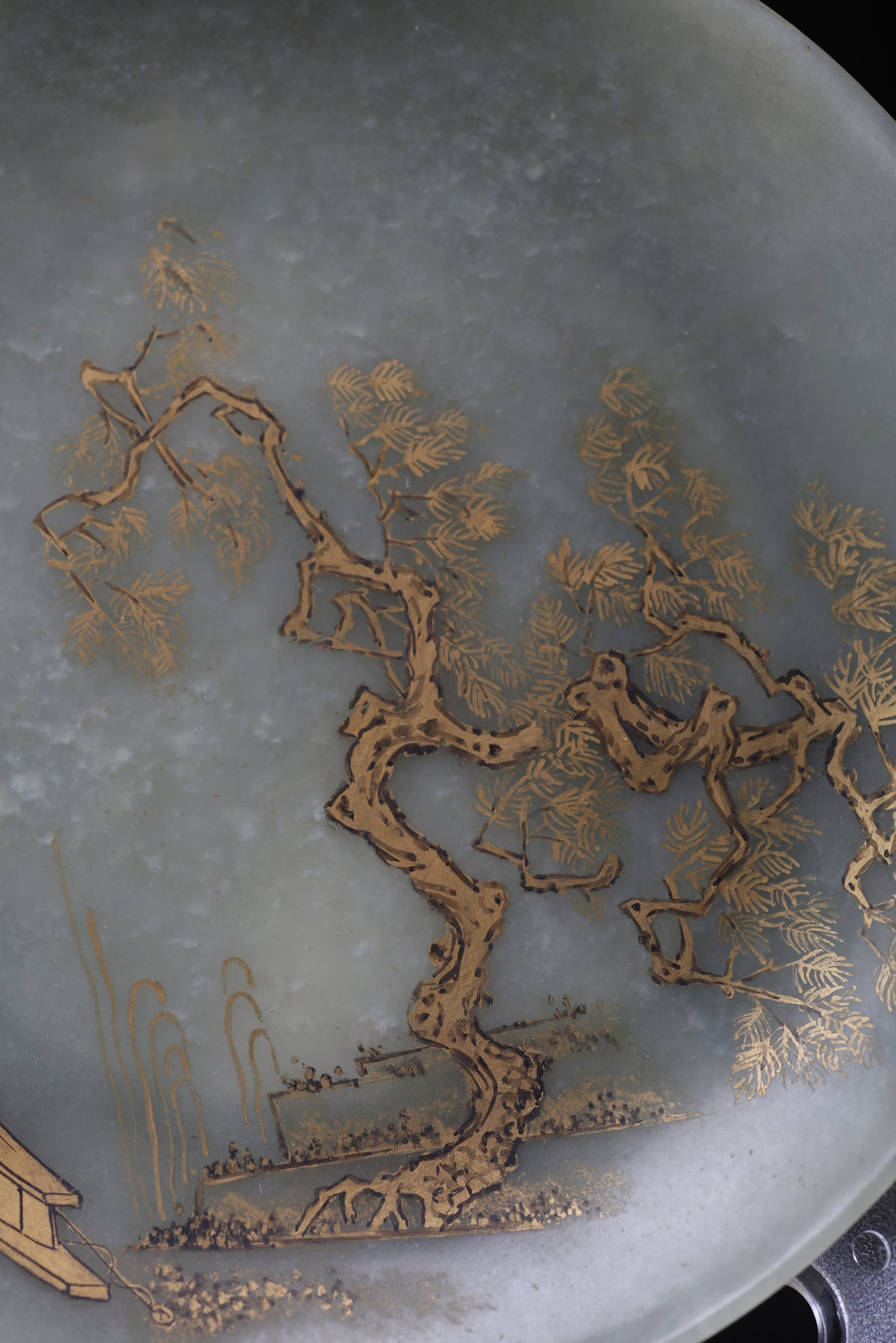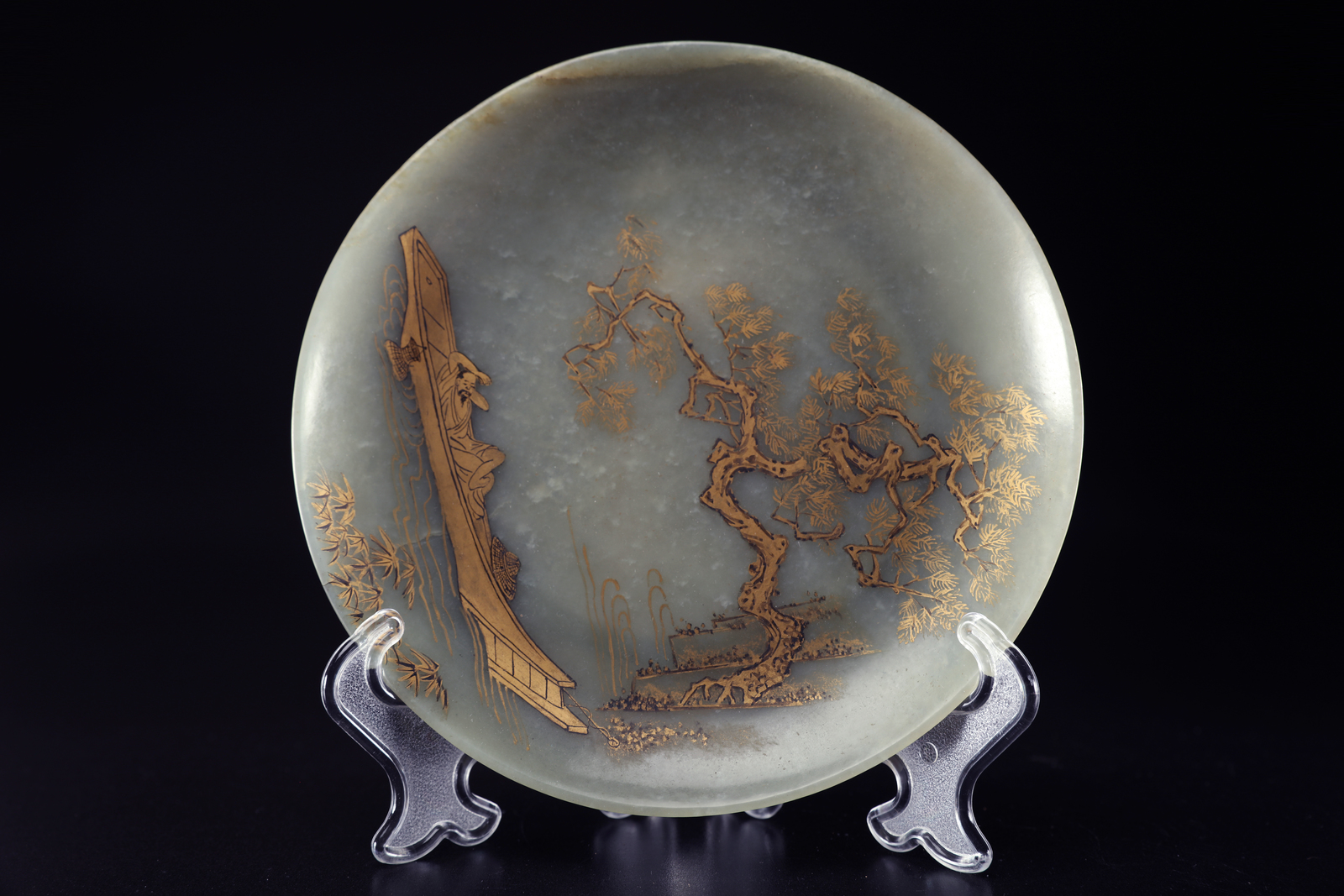 Arte Cinese Piatto in giada con decoro dorato raffigurante un paesaggio...