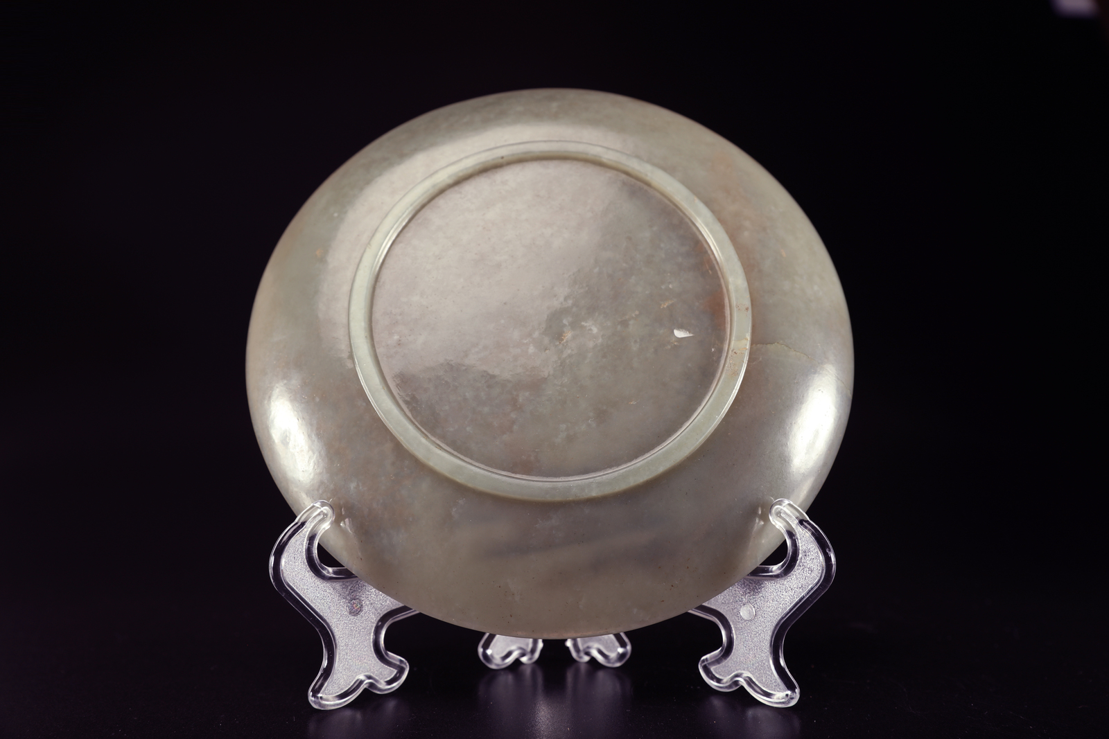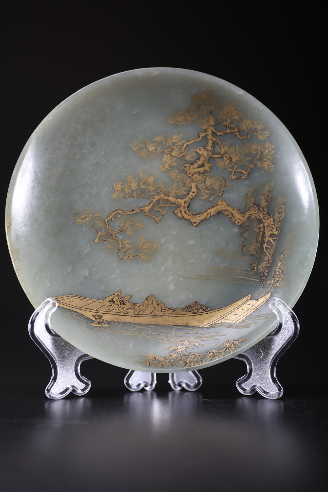 Arte Cinese Piatto in giada con decoro dorato raffigurante un paesaggio lacustre con barca