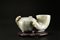 Cina, dinastia Ming. . Cm 19,00 x 10,20. Portapennelli e lavapennelli intagliati in giada, l'uno nella forma di una quaglia, l'altro in forma di vasetto arricchito da coppia di chilong in rilievo. Entrambi mostrano piccole dragoni stilizzati incisi sulla parte superiore. Stand in legno.