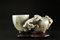 Arte Cinese A grey celadon jade brush holder in the shape of a quail and brush washer vase decorated with chilongs in relief. Wooden stand.