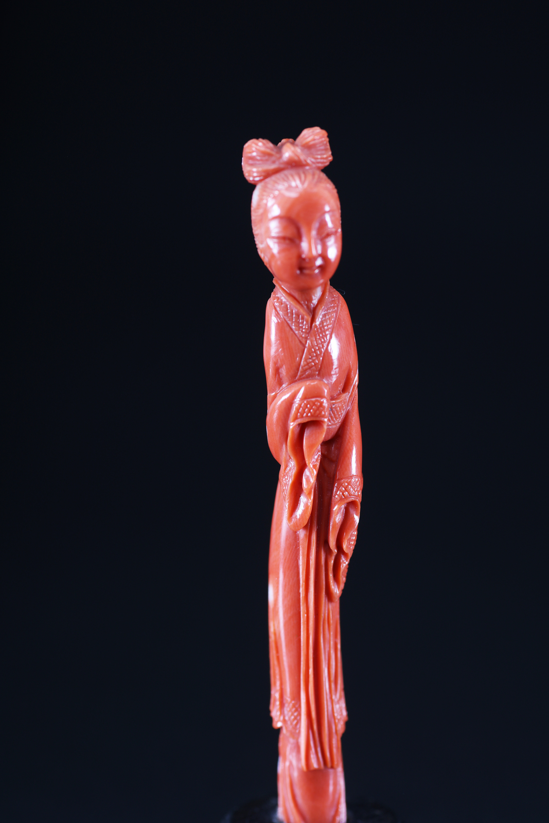 Cina, XX secolo. . Cm 10,50. La minuta figura femminile in corallo finemente intagliato stante su una base circolare in legno con doppio livello.