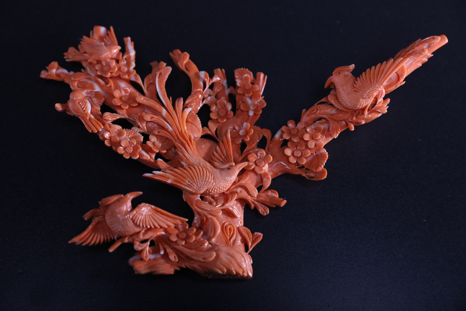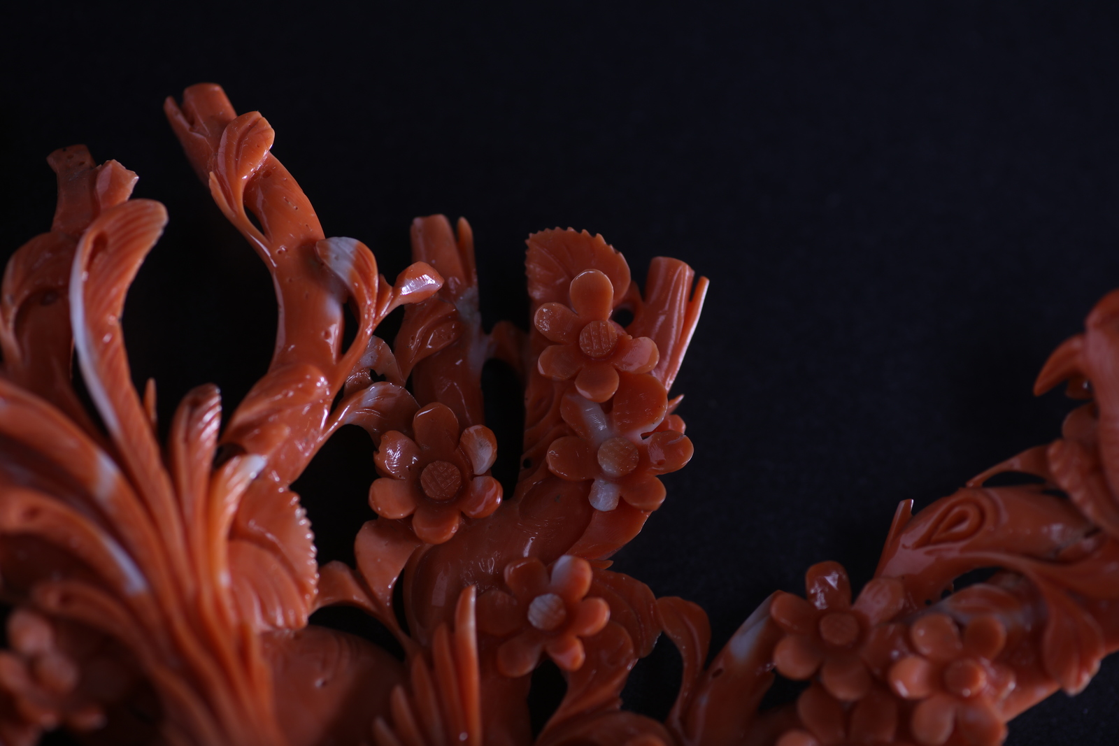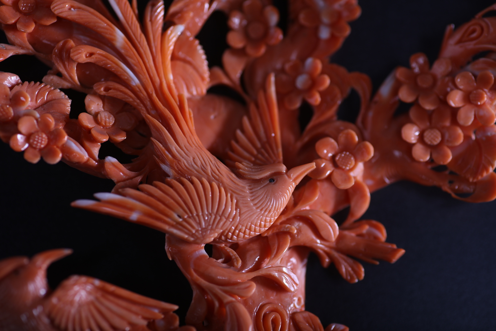 Cina, XX secolo. . Cm 22,70 x 12,40. Corallo a più braccia intagliato con raffigurazioni di fenici su rami e fiori di pesco.