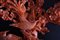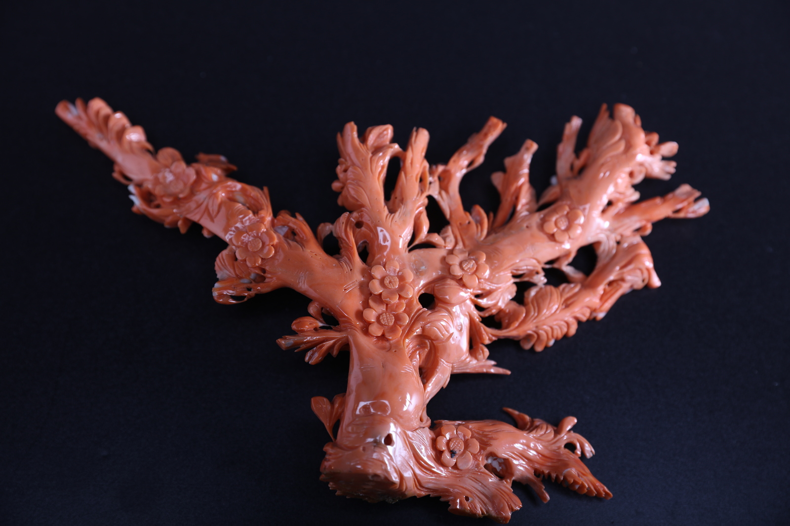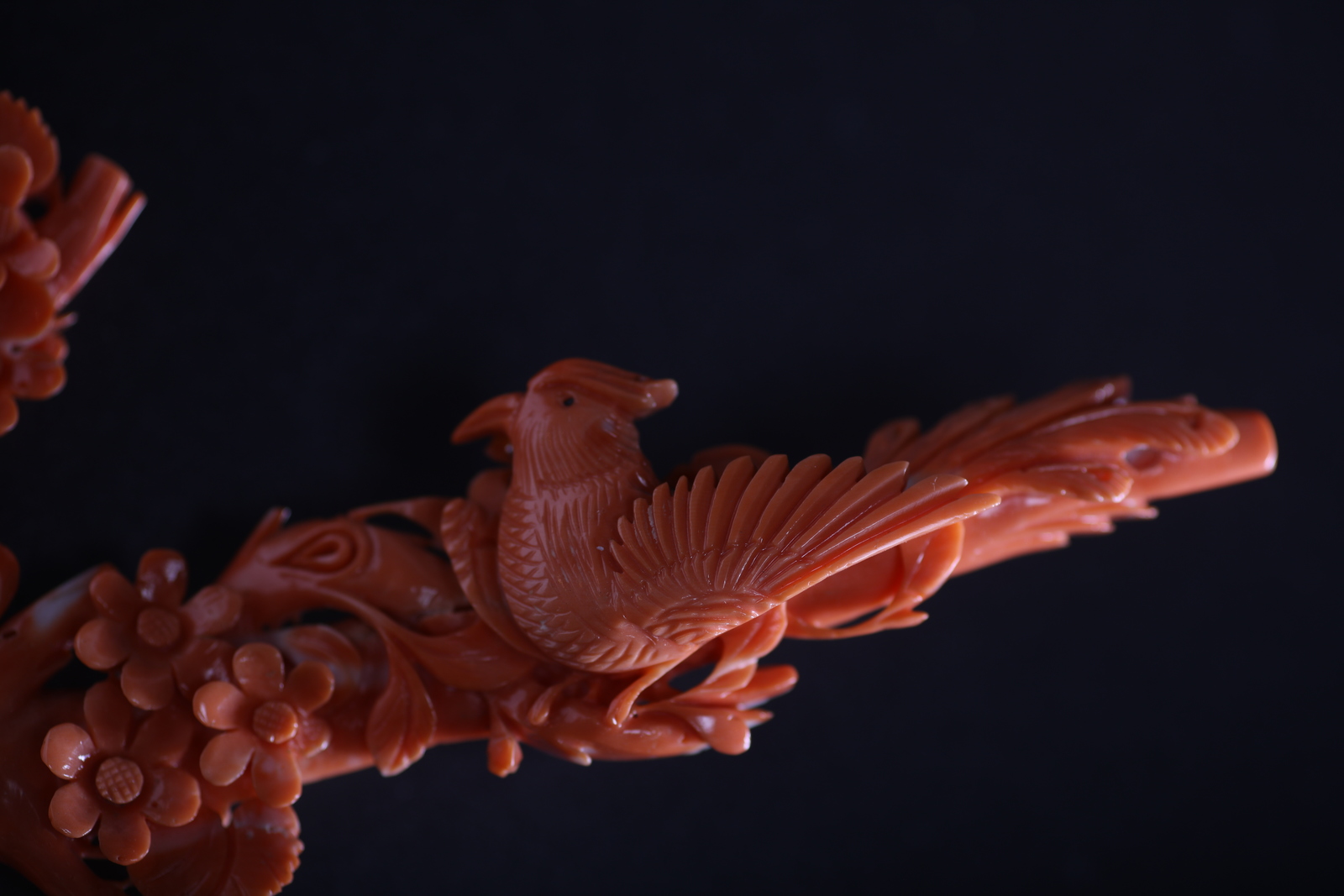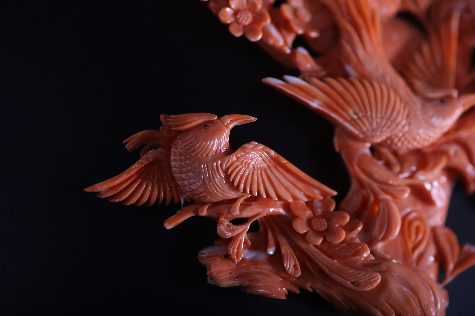 Cina, XX secolo. . Cm 22,70 x 12,40. Corallo a più braccia intagliato con raffigurazioni di fenici su rami e fiori di pesco.