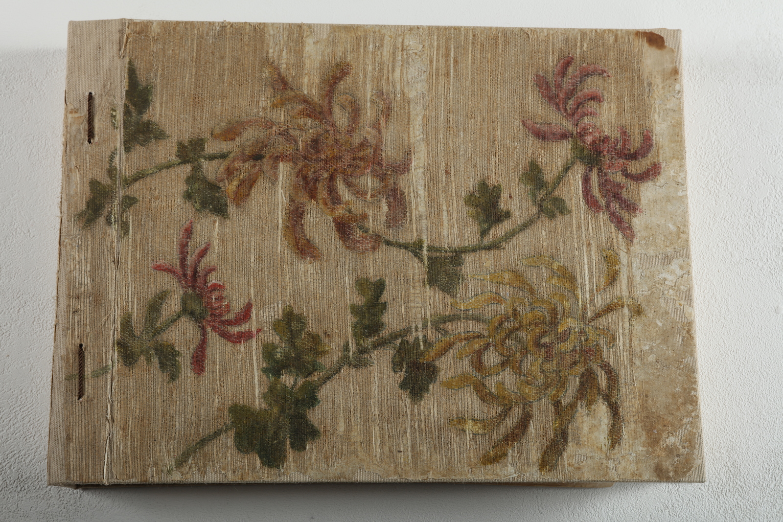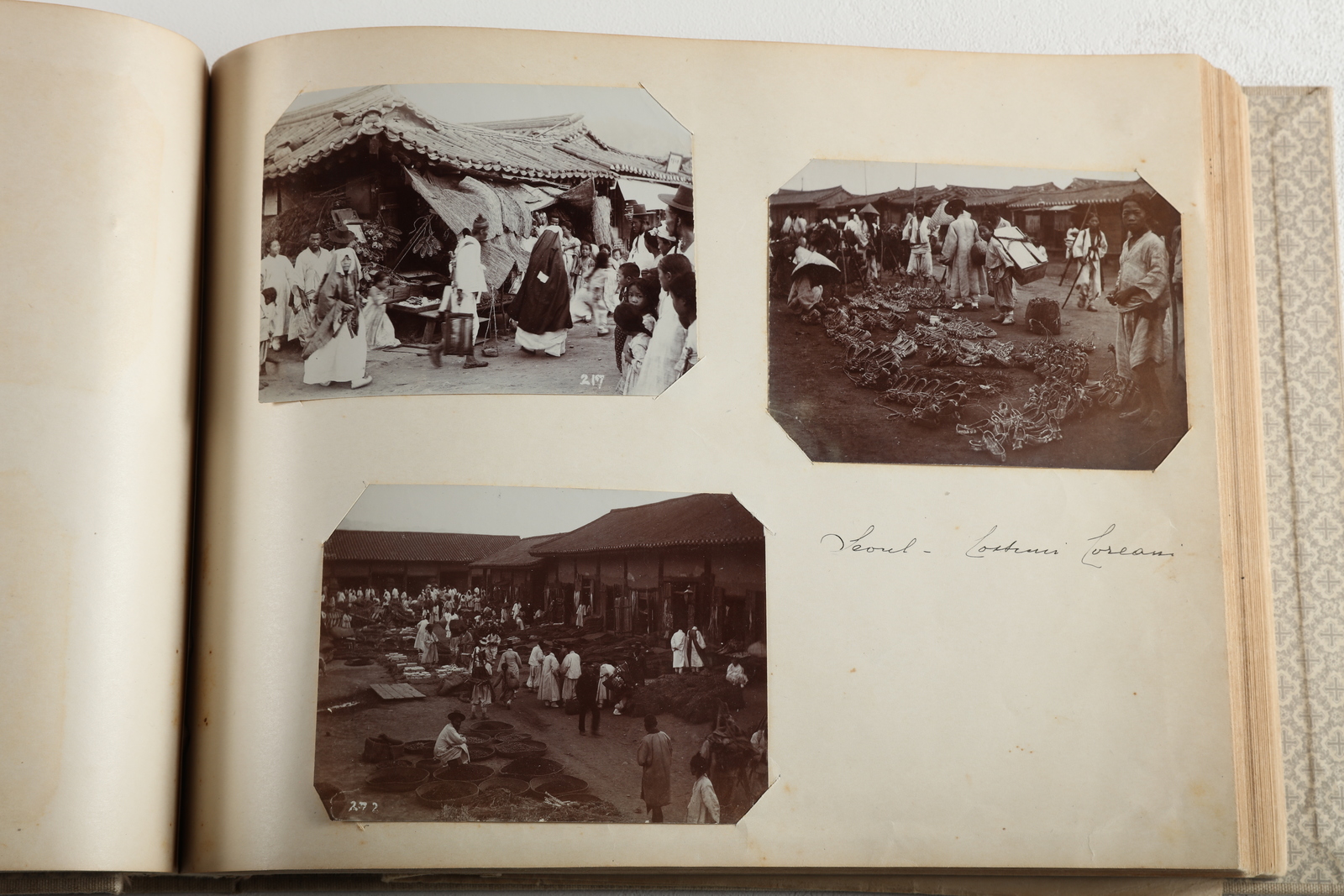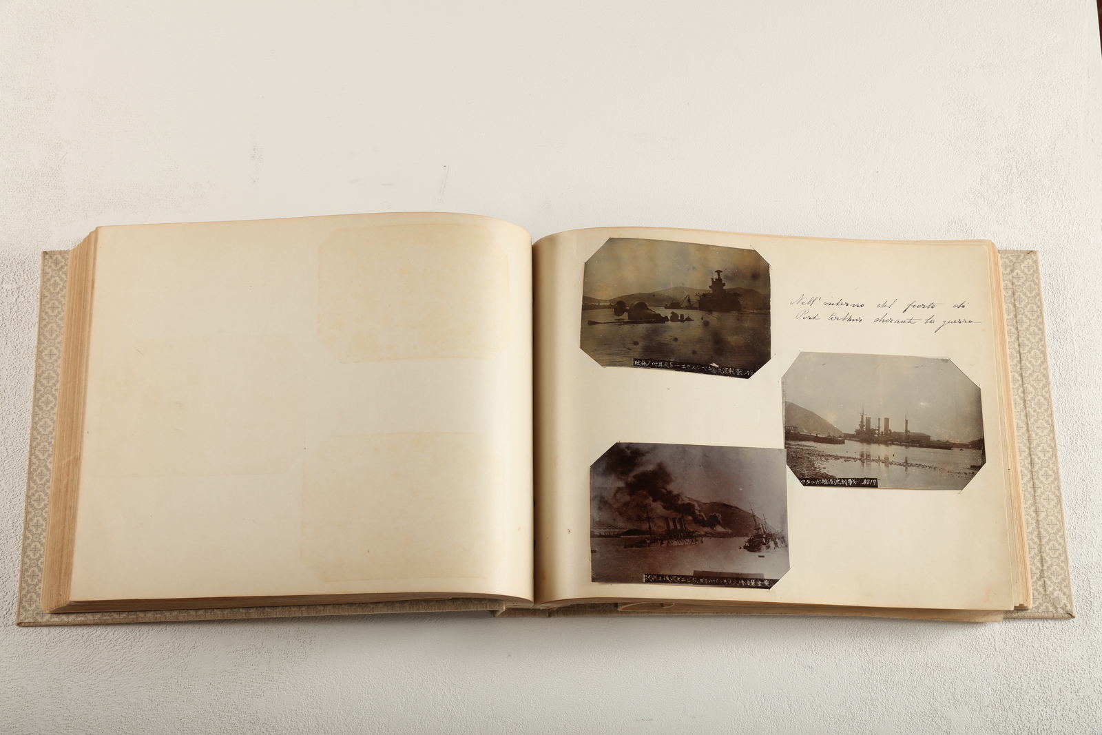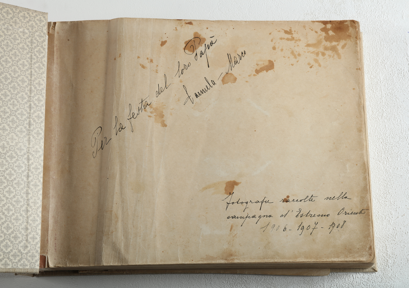Inizio XX secolo. . Cm 36,80 x 27,30. Copertina floreale in tessuto, la prima pagina reca una dedica scritta a mano che recita: "Per la festa del loro papà Carmela e Marco. Fotografie raccolte nella campagna dell'estremo Oriente, 1906-1907-1908". L'album contiene 181 fotografie in stampa argentica all'albumina e cartoline. Talune fotografie sono accompagnate da descrizioni scritte a mano.