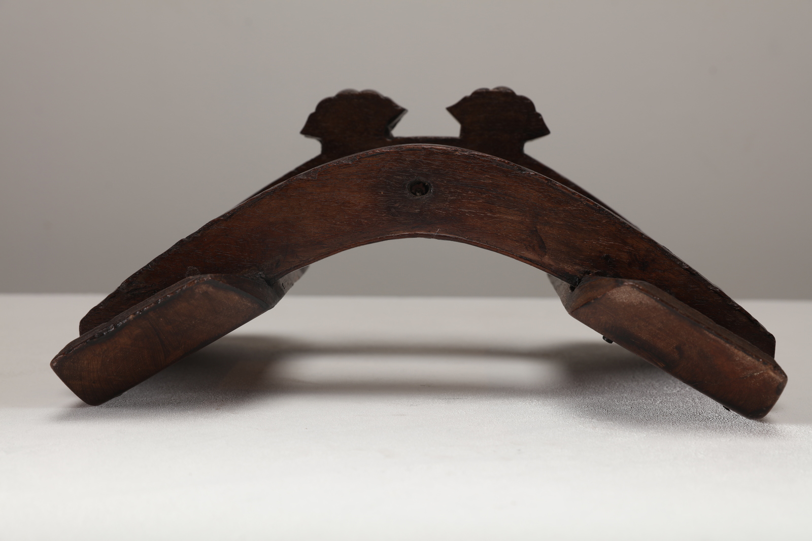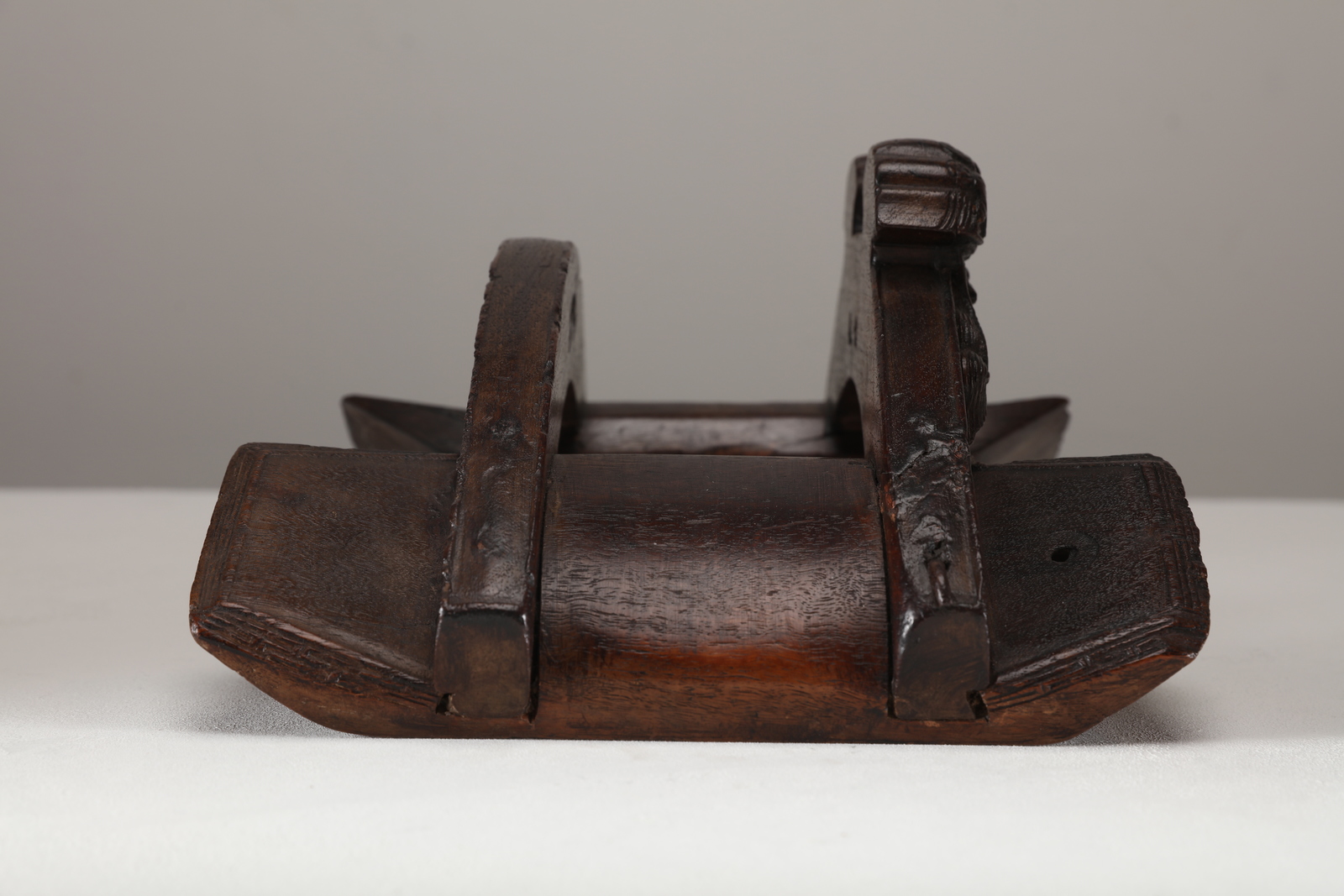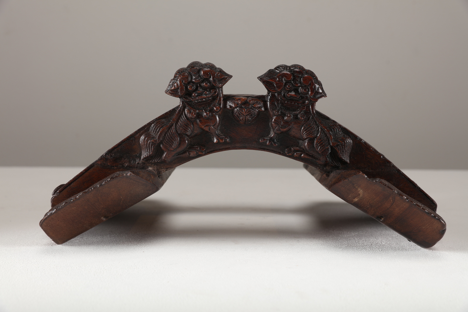 Arte Cinese Sella in legno duro Cina, dinastia Qing, XVIII secolo . . Cm 33,00 x 28,00. Piccola sella lignea intagliata con raffigurazioni di cani di pho sull'arcata frontale.