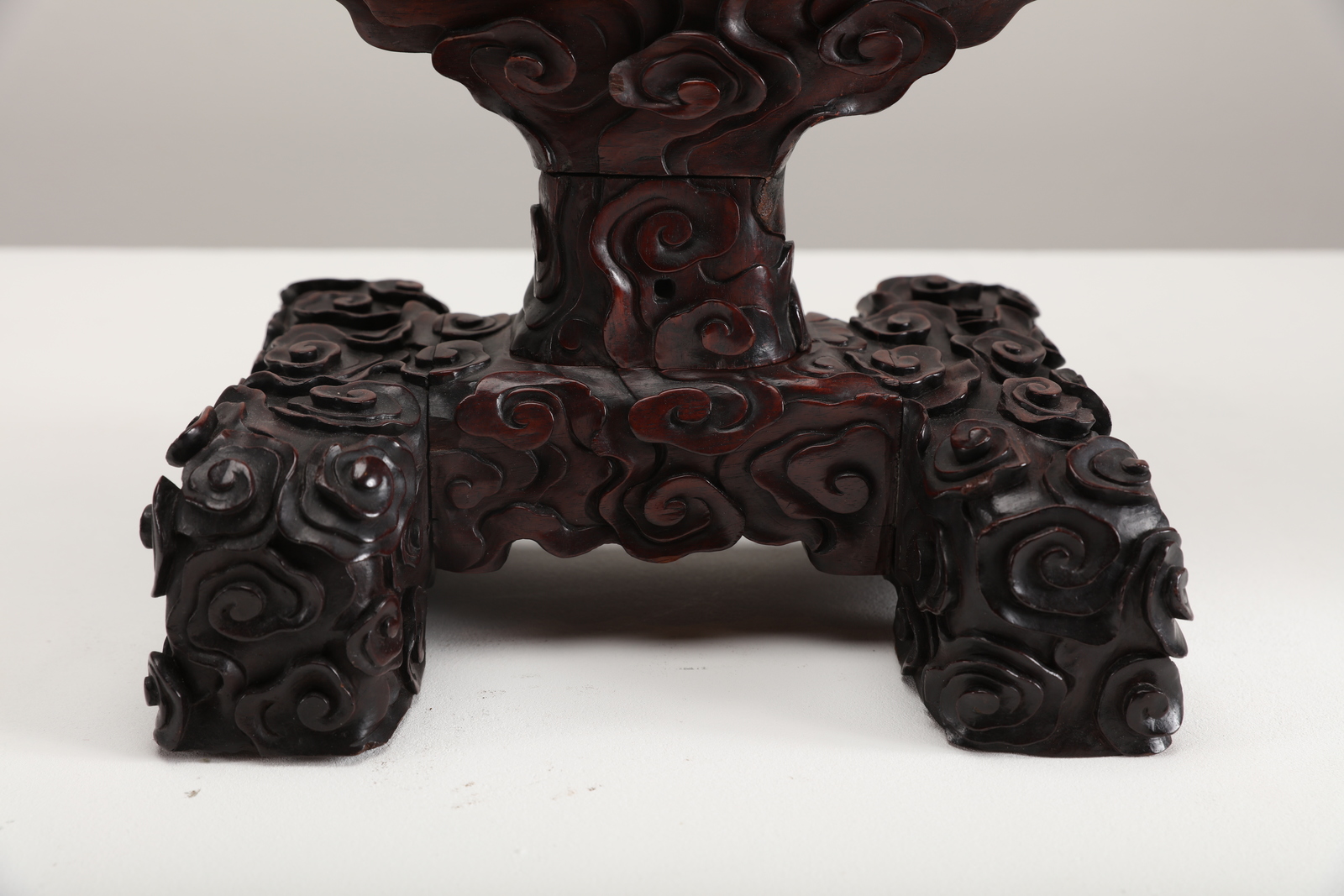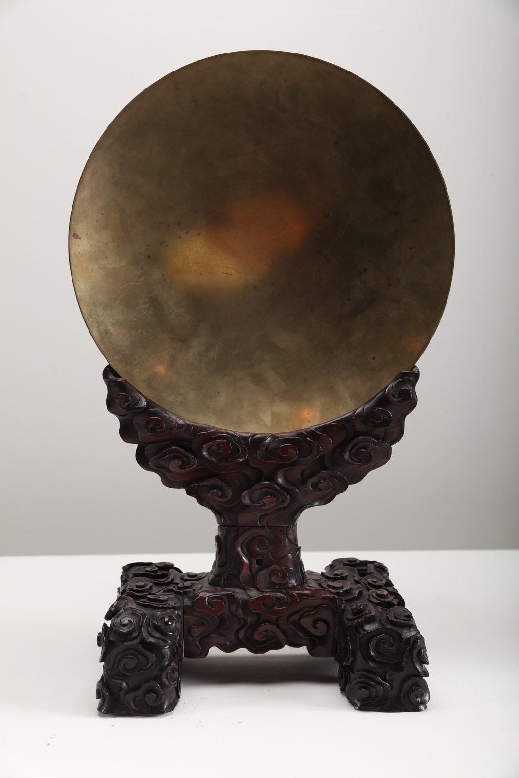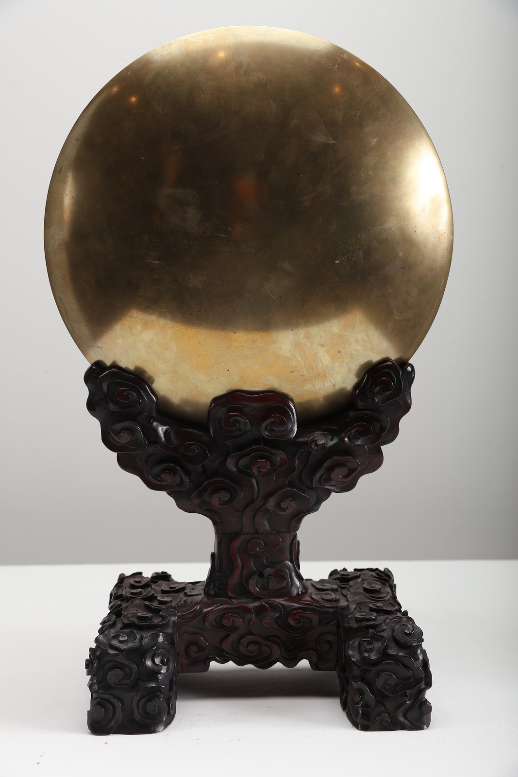 Arte Cinese Grande parabola in bronzo con base in legno di hongmu intagliato con decoro di nuvole
