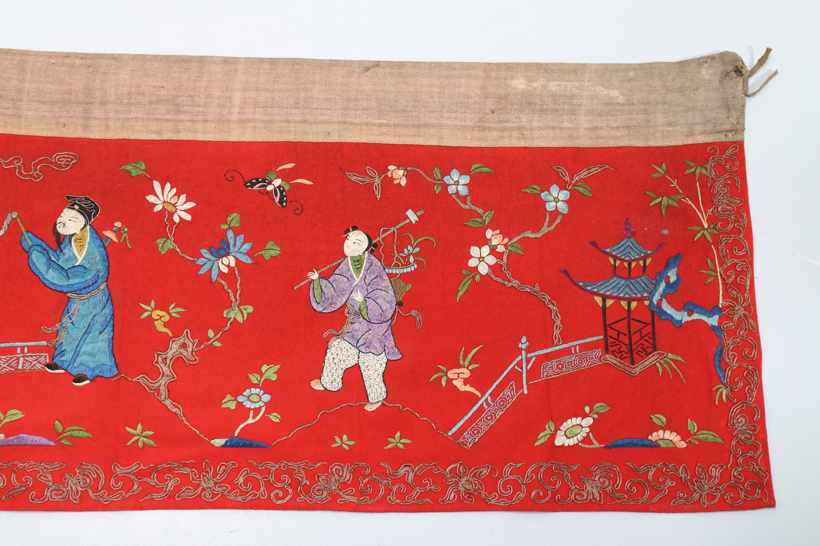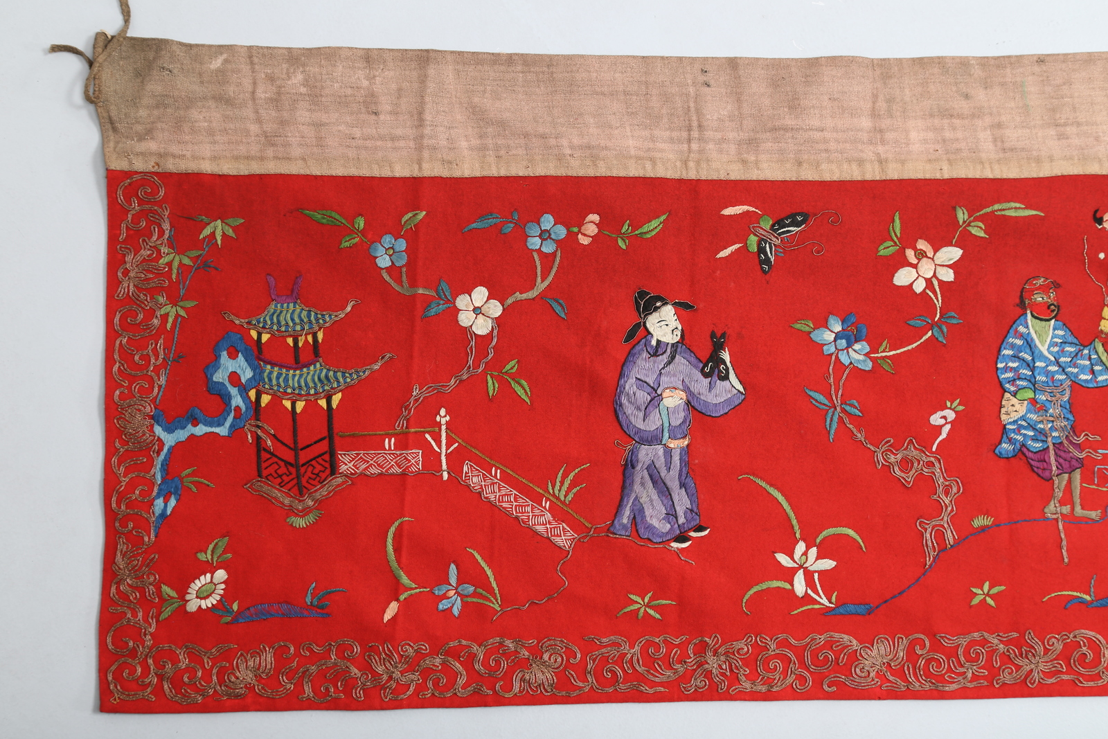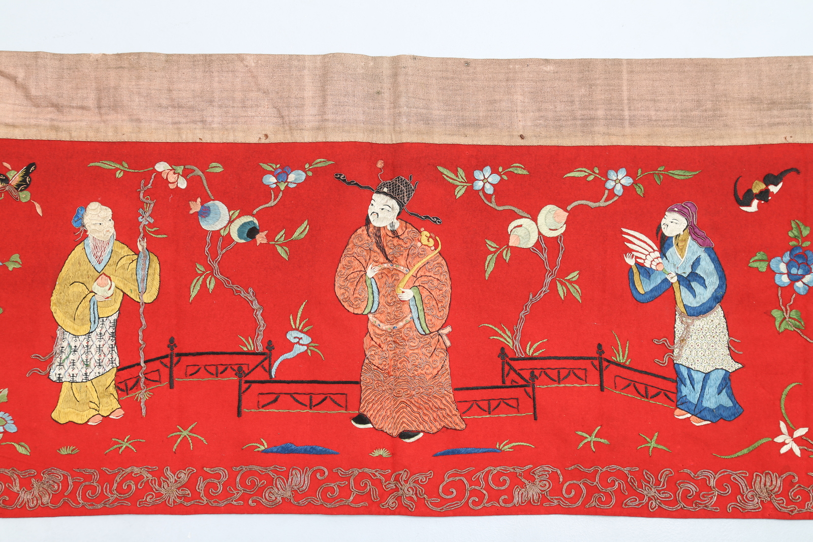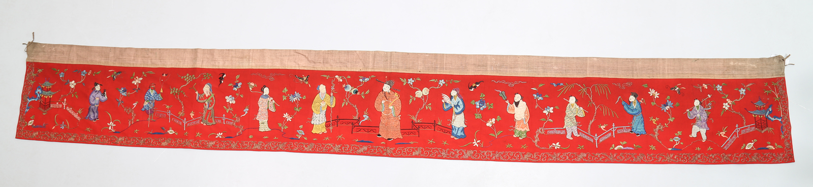 Arte Cinese A long wool stripe on red background embroided with the eight immortals framed by plants