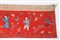Cina, dinastia Qing, XIX secolo. . Cm 375,00 x 50,00. Lunga fascia in lana rossa ricamata con le otto figure degli immortali della tradizione taoista inquadrate da piante in fiore. Bordo superiore e retro color crema.