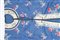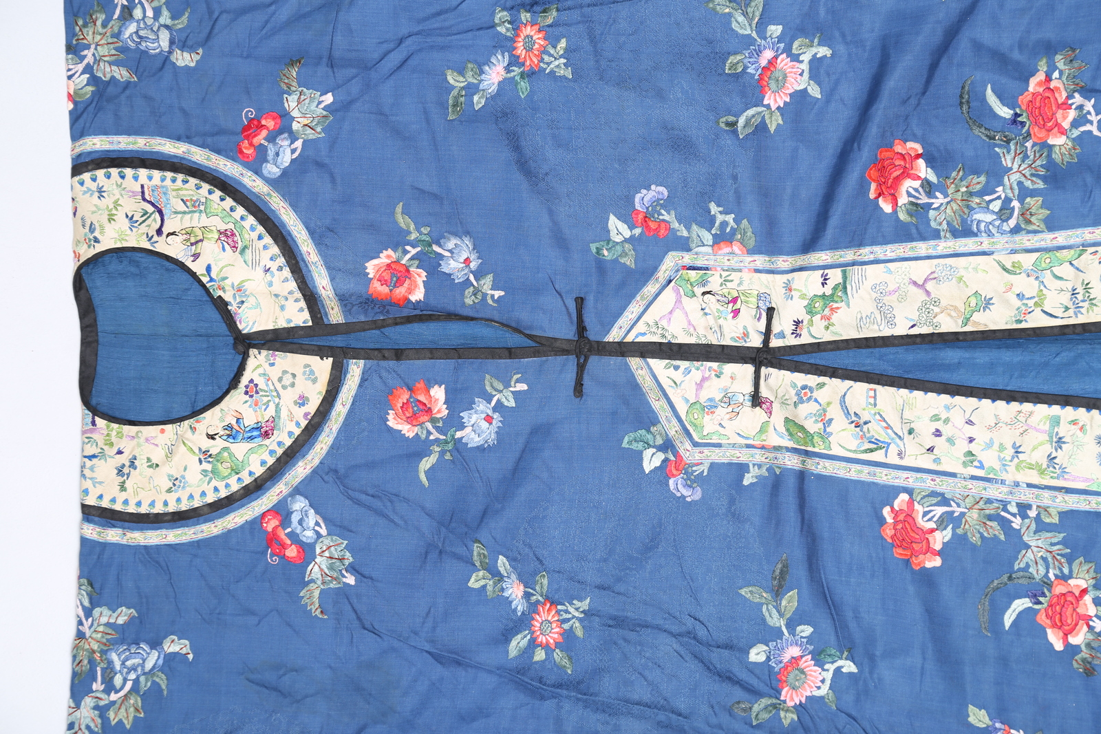 Cina, dinastia Qing, XIX secolo. . Cm 110,00. Broccato in seta blu decorato con medaglioni contenenti draghi alla ricerca della perla fiammeggiante, ricamato con fiori di diversa tipologia nei toni del rosa e del blu. Orlo in seta color crema ricamato con figure femminili, piante e alberi. Interno piano in seta blu.