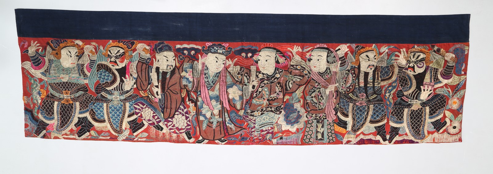 Cina, dinastia Qing, XIX secolo. . Cm 315,00 x 93,00. Sopra un tessuto a fondo rosso sono rappresentati molti personaggi tra cui signore, guerrieri e guardiani. Bordo superiore blu e retro beige. Qualche toppa sul retro.