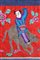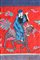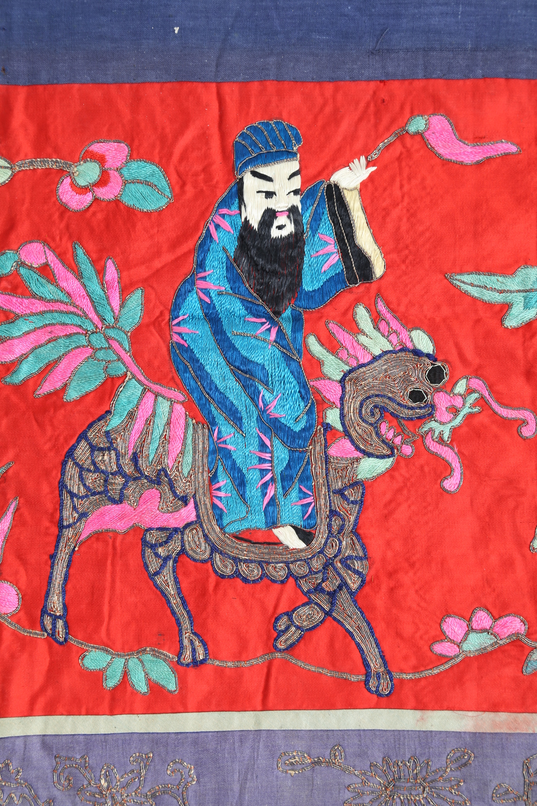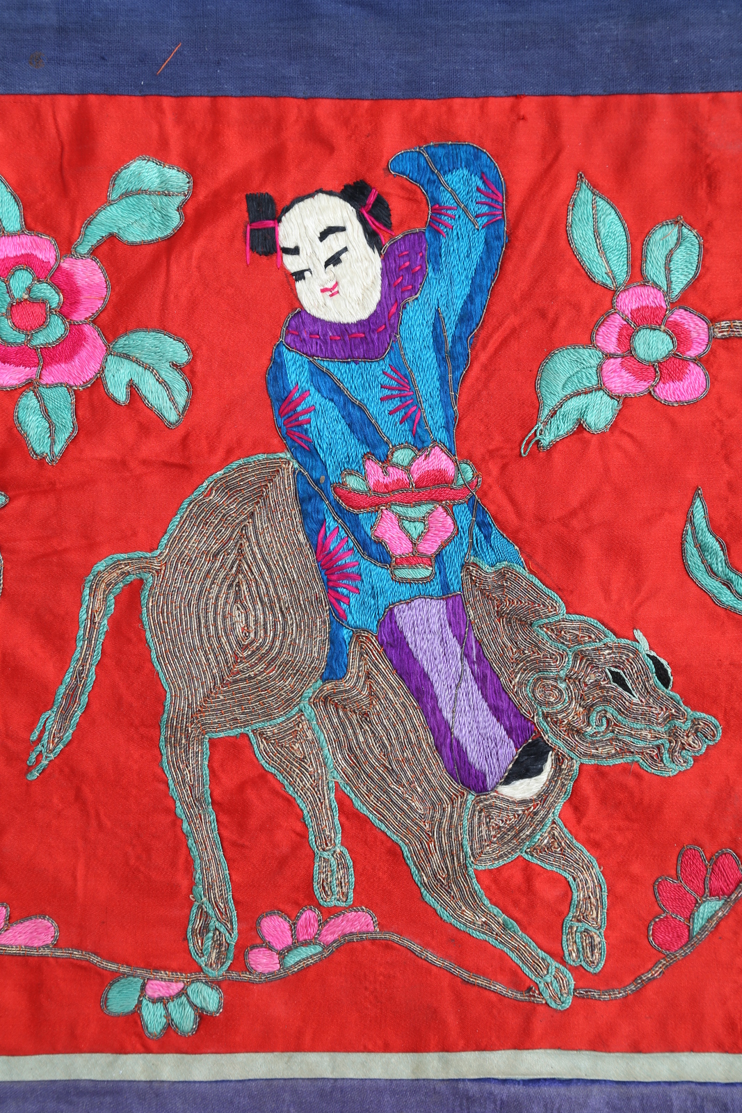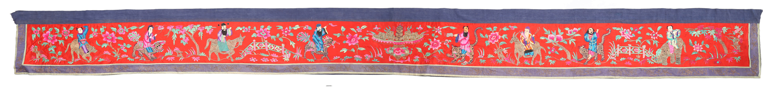 Arte Cinese A very long red silk stripe embroided with characters riding foodogs and dunkeys among flowers and vine sprays. Blue edges and back.