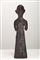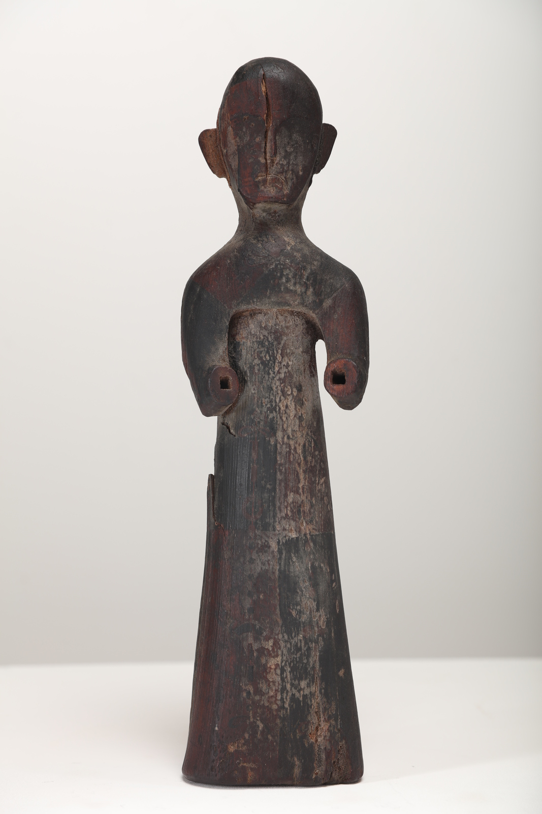Cina, periodo Stati Combattenti o antecedente . . Cm 10,50 x 42,50. Antenato in legno appartenente alla cultura del Regno di Chu (Nord Est della Cina, 1030 - 223 AC) ritratto in posizione stante e con tratti stilizzati. Il personaggio è coperto di lacca nera e rossa, una consuetudine tipica del regno di Chu, e mostra tratti del volto, gioielli e pendenti laccati, originariamente in rilievo, ora apparentati con il corpo ligneo. La veste è inoltre decorata a quadri, mentre mancano mani e piedi, ormai degradati.