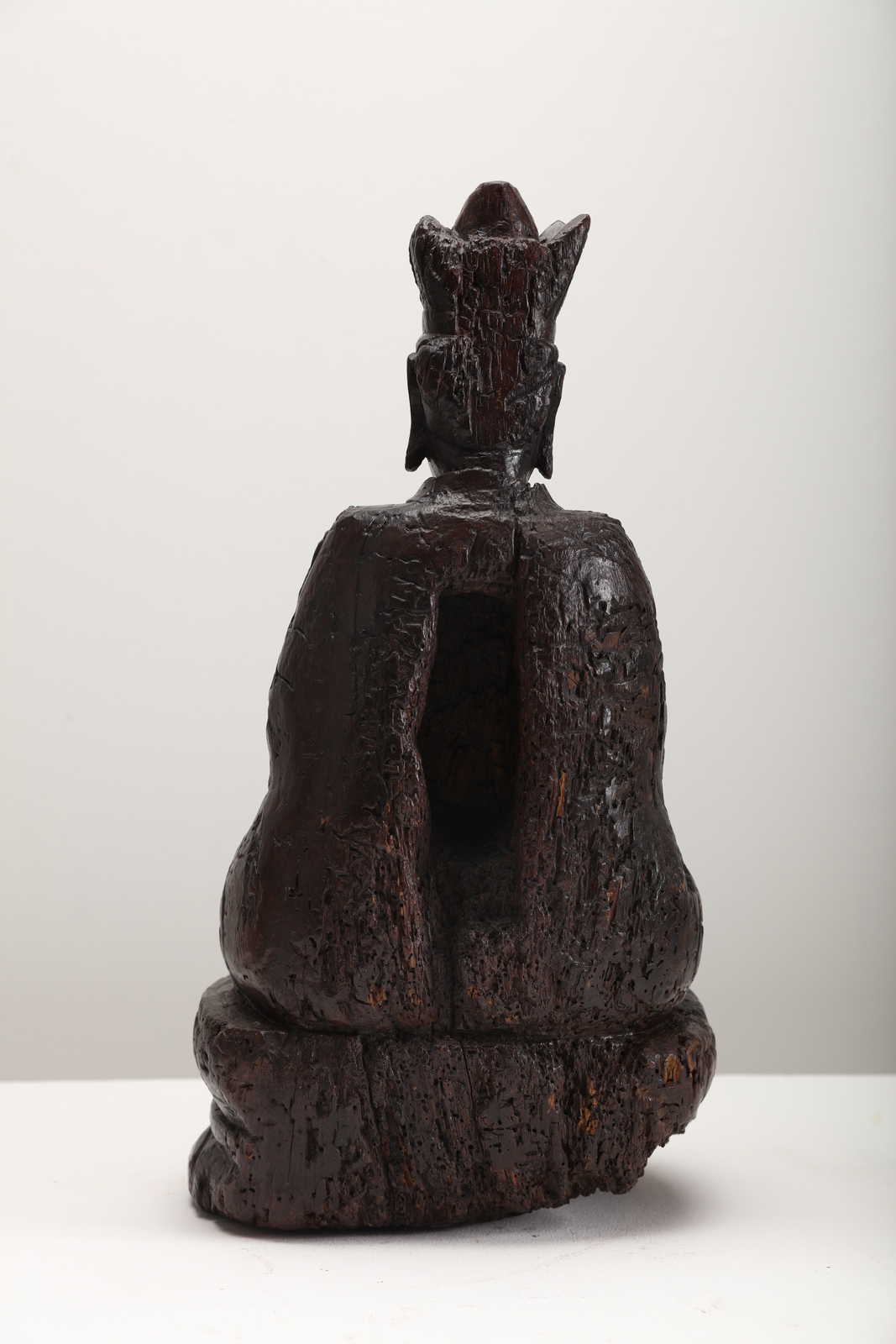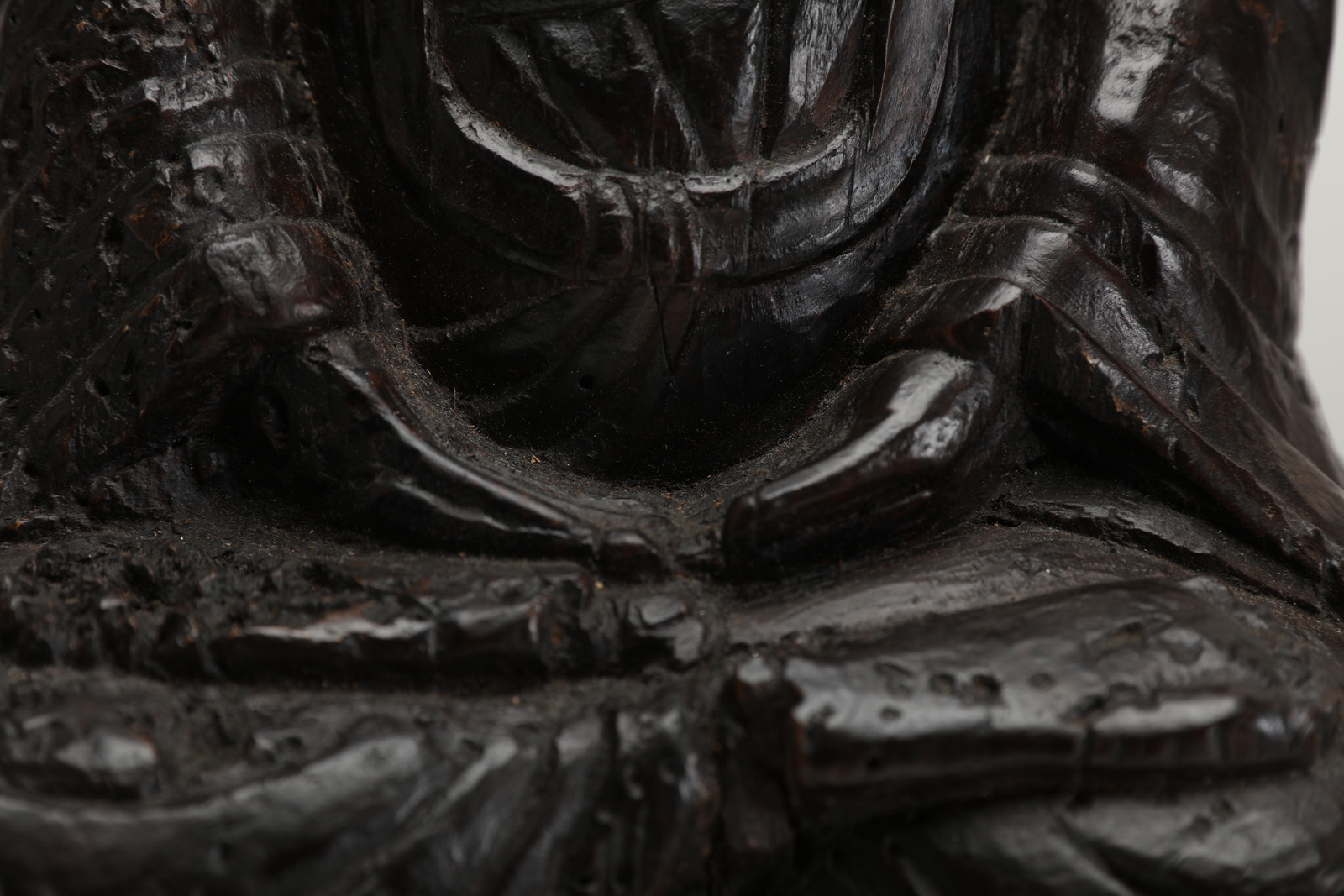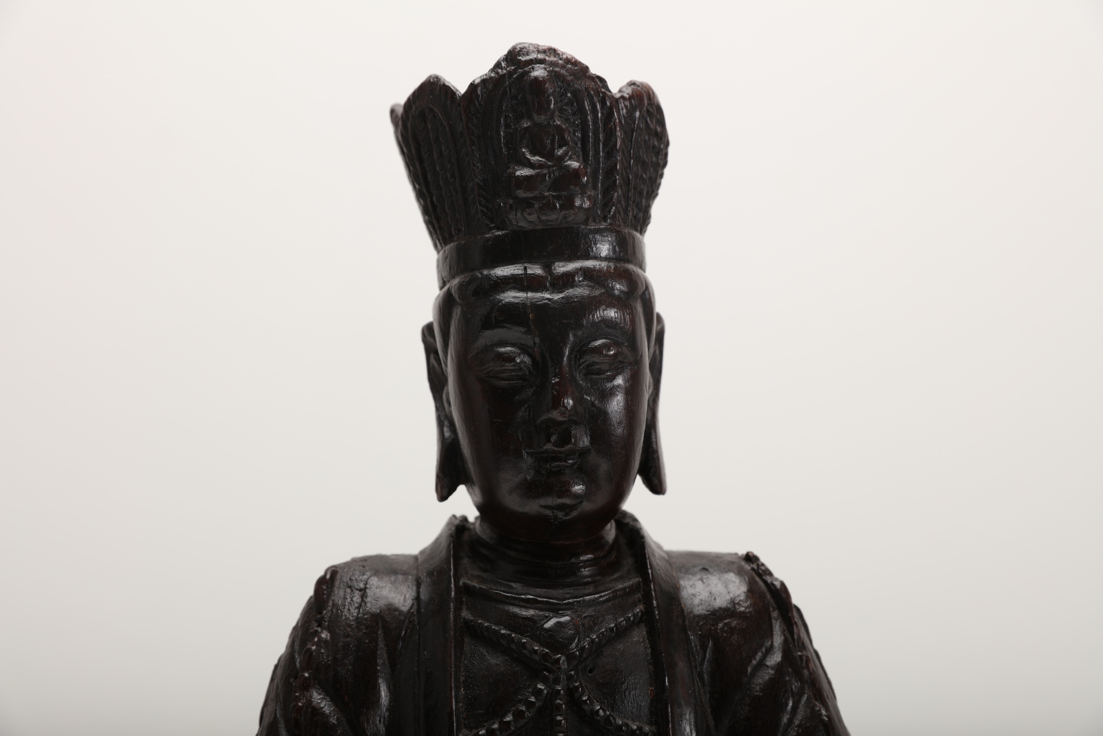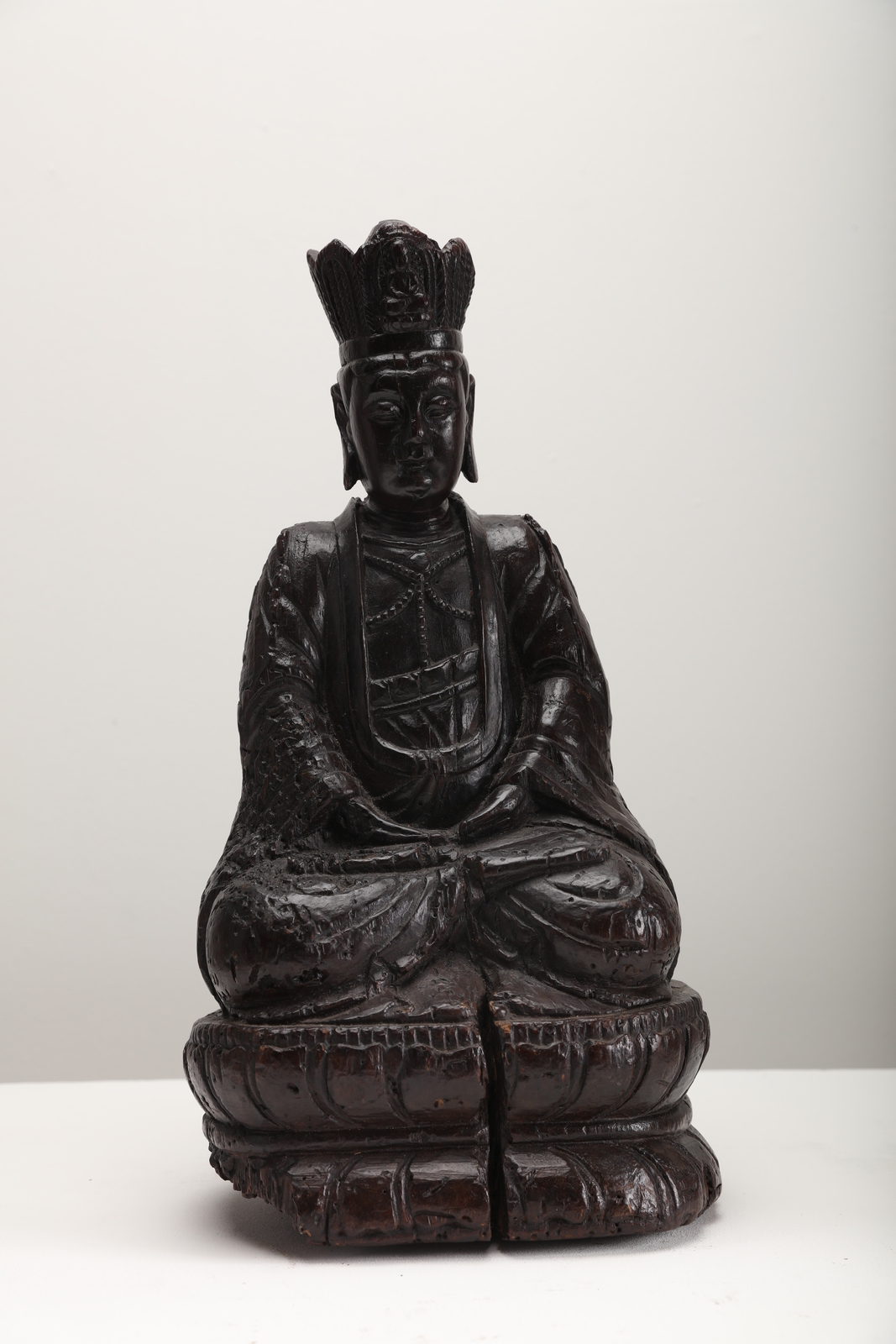 Arte Cinese Scultura in legno duro raffigurante Avalokitesvara Cina, dinastia Yuan, XIII - XIV secolo . . Cm 21,00 x 50,00. Su base a loto singolo si erge la figura del bodhisattva della compassione seduto in padmasana, le mani giunte in grembo in dhyanamudra, le ricche vesti e gli opulenti gioielli abbelliscono la figura dal volto sereno ed ornato dalla corona a cinque punte contenente il Buddha trascendente Amitabha, di cui Avalokitesvara è emanazione.