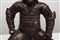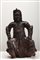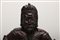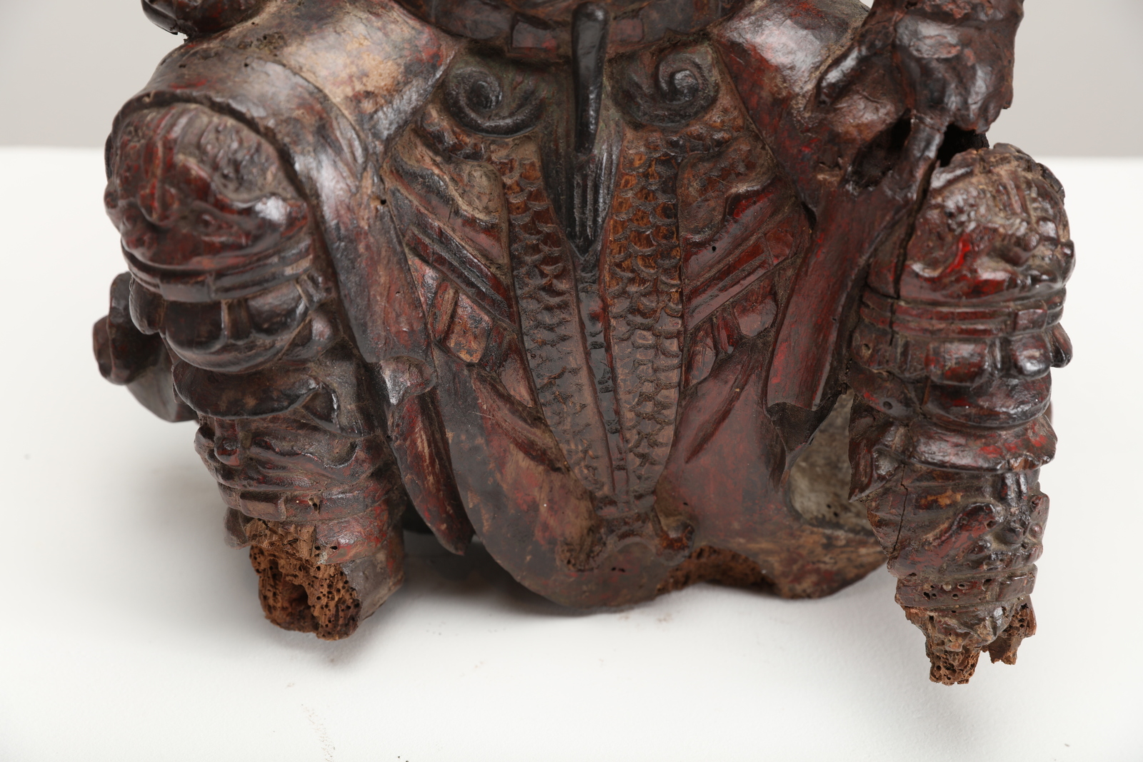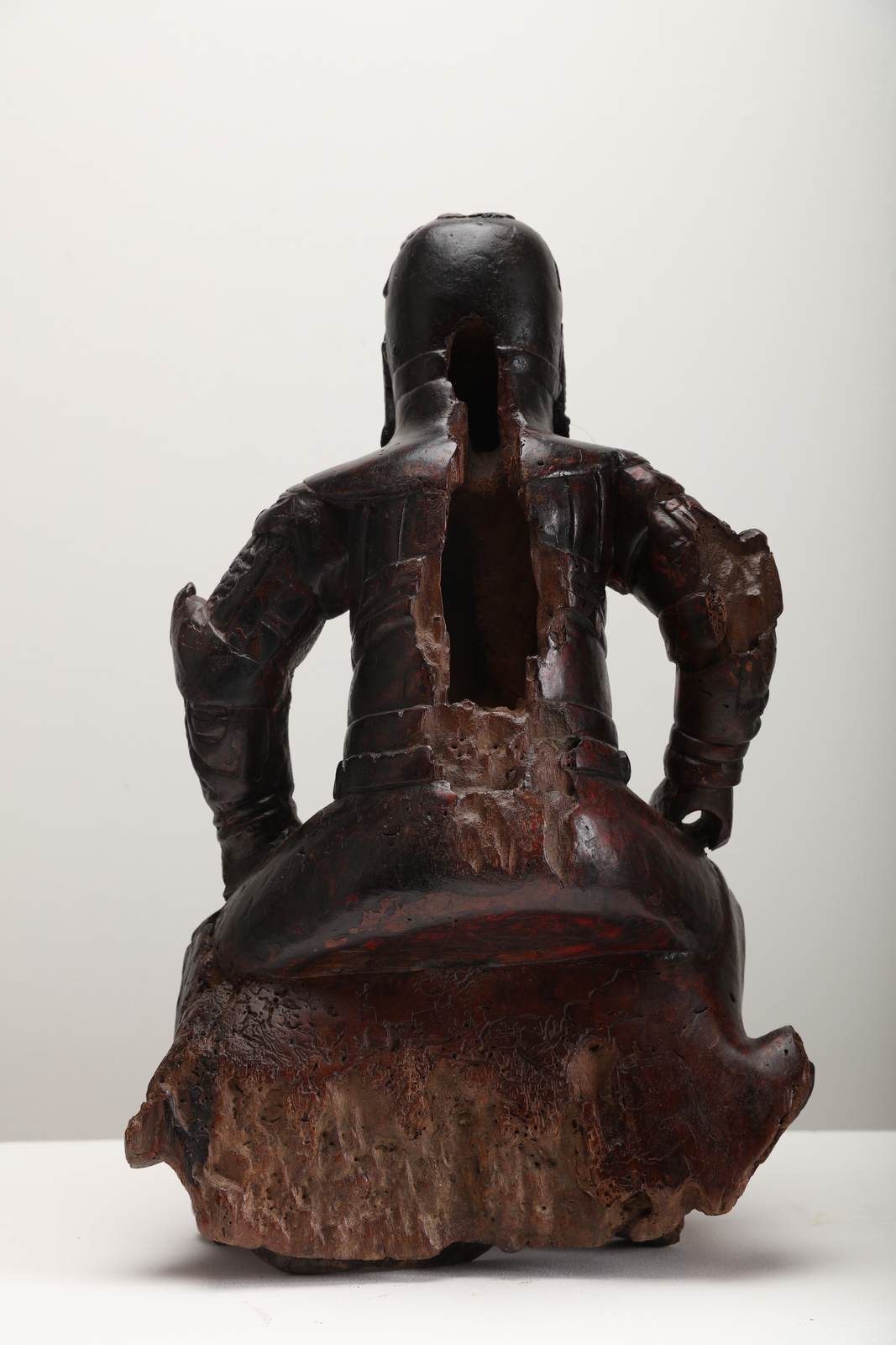 Cina, dinastia Yuan, XIII secolo . . Cm 34,00 x 53,00. Grande statua lignea ritraente il mitico generale cinese divinizzato Guandì. La figura presenta un intricato lavoro di intaglio specialmente nella resa della decorazione dell'armatura. Il volto è arricchito da una barba realizzata in pelo animale, probabilmente non coevo, mentre sul retro è presente una cavità atta a contenere elementi sacri ad uso devozionale.