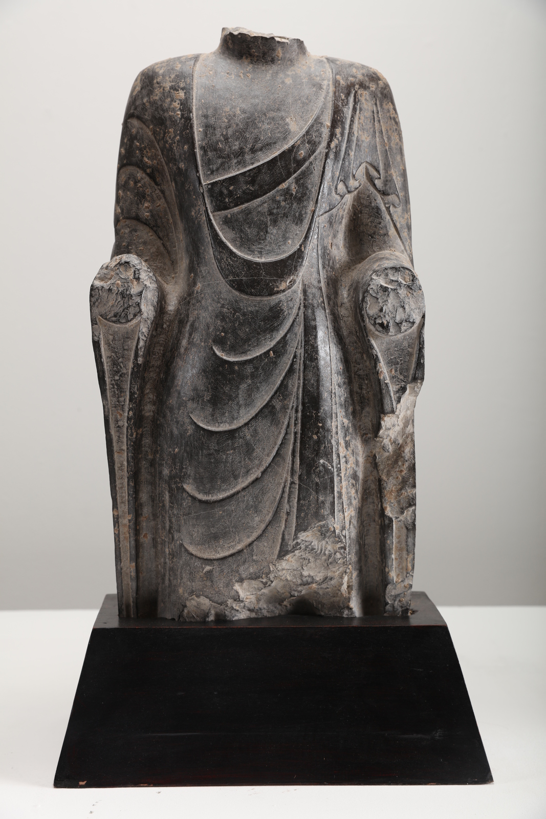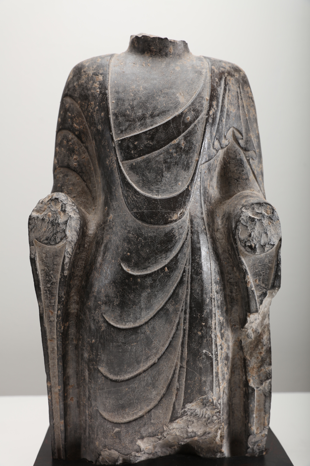 Cina, periodo Wei, V - VI secolo . . Cm 31,50 x 57,00. La figura stante ha perso le braccia, la testa e gli attributi ed è perciò difficile stabilirne l'identità. L'oggetto è montato su una bassa base scura.