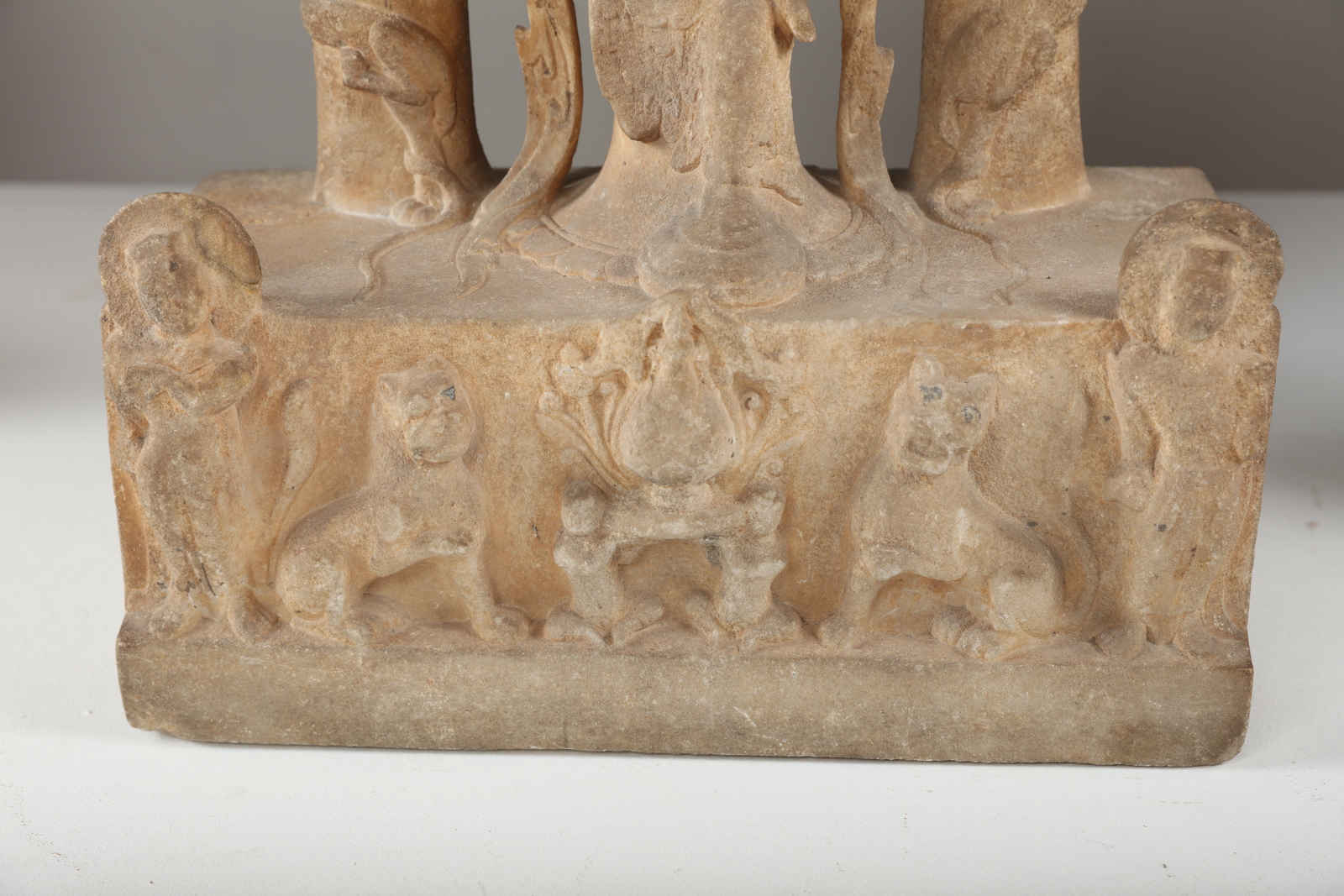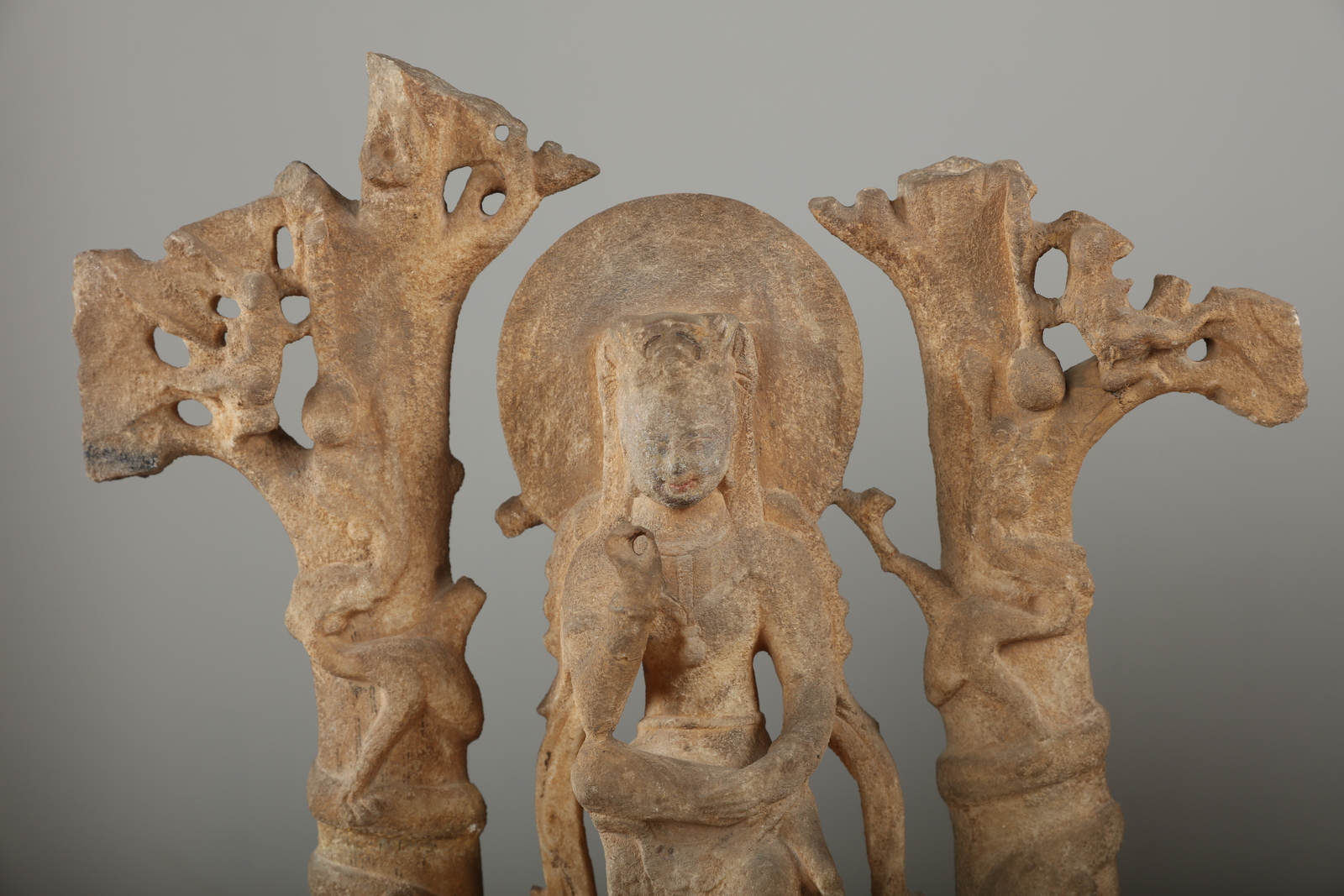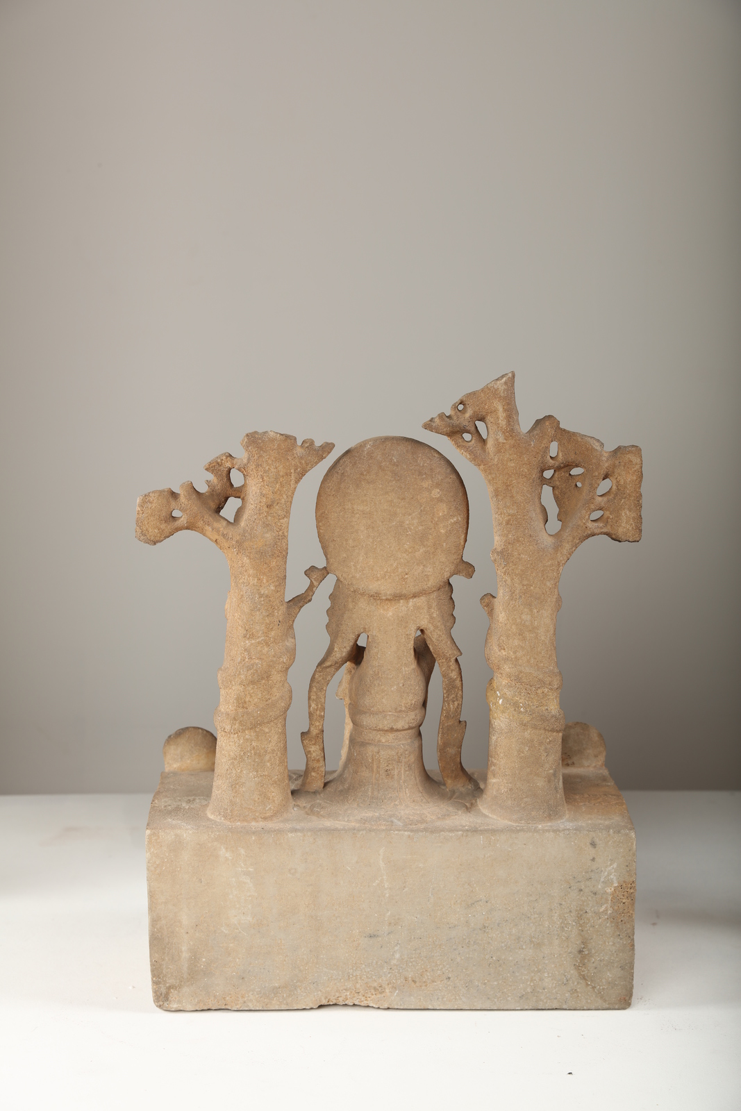 Cina, dinastia Qi, V - Vi secolo . . Cm 39,00 x 51,50 x 17,50. Scultura in arenaria probabilmente raffigurante il Buddha del futuro seduto in posa meditativa su un altare raffigurante due leoni affrontati accanto ad un fuoco e due offerenti ai lati. Il sereno volto della figura è abbellito da una corona e circondato da un'aureola circolare, il tutto inquadrato da due alberi caratterizzati da due dragoni attorcigliati al tronco.