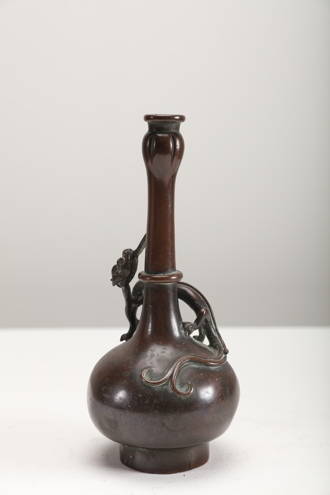 Arte Cinese A dark bronze bottle with tall neck terminating with a garlic head and a twisted chilong decoration